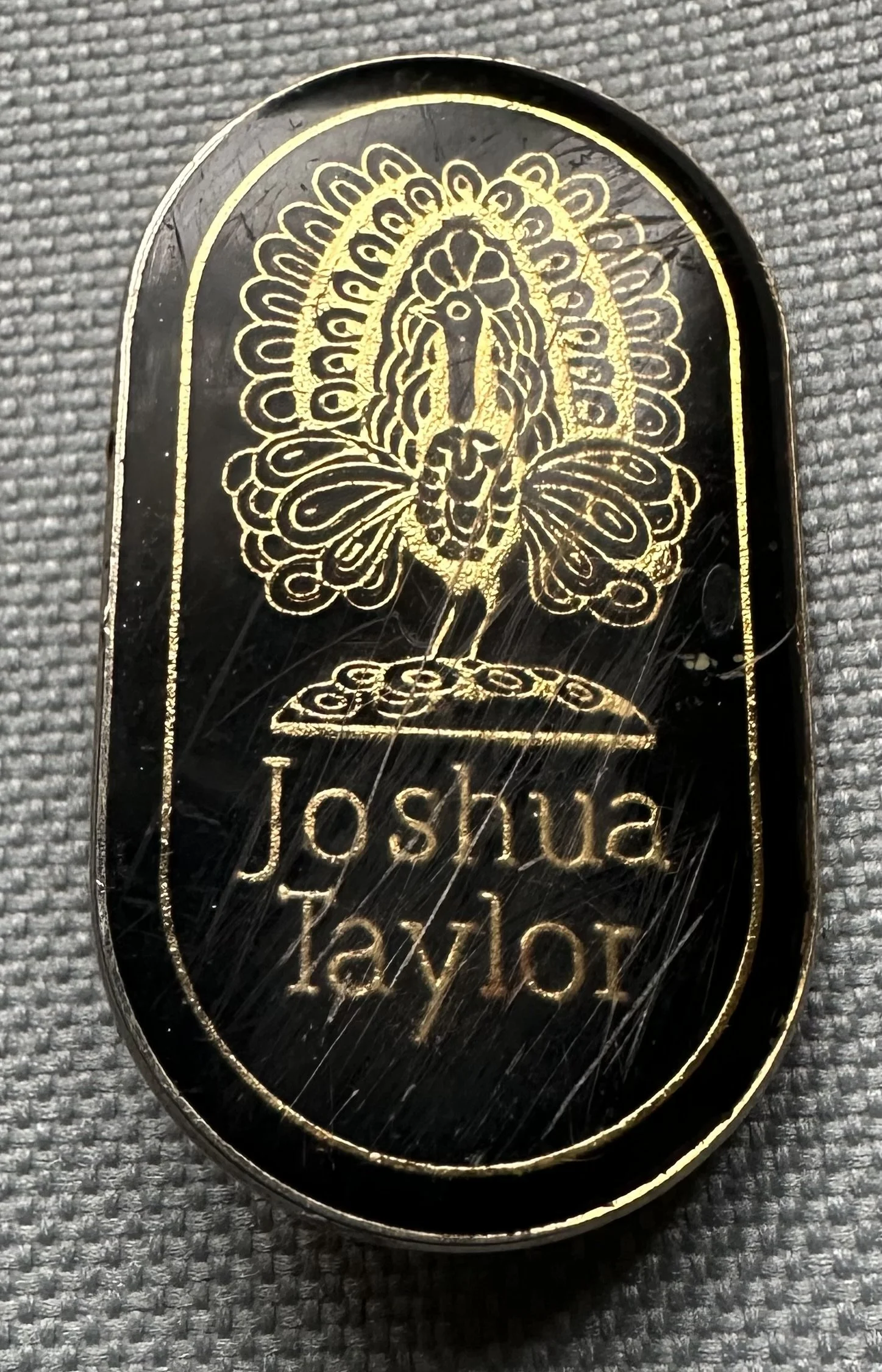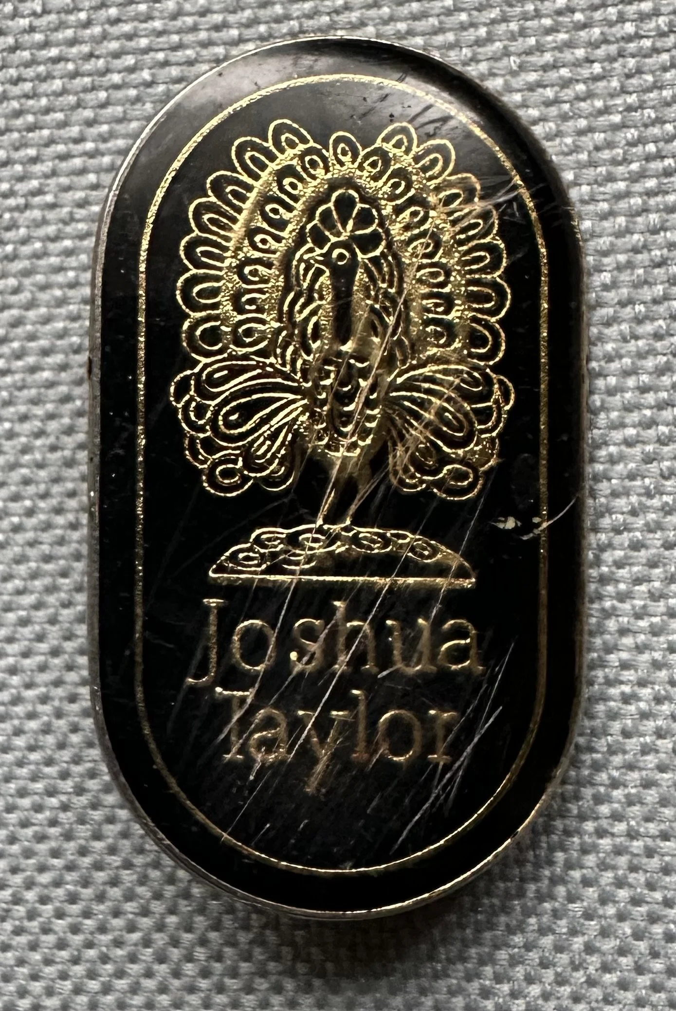 Joshua Taylor Shop Badge, Market Street Cambridge c.1990. Black with gold detail. I did a couple of days work experience there in about 1990/91, I’m not sure if this is where I got the badge.