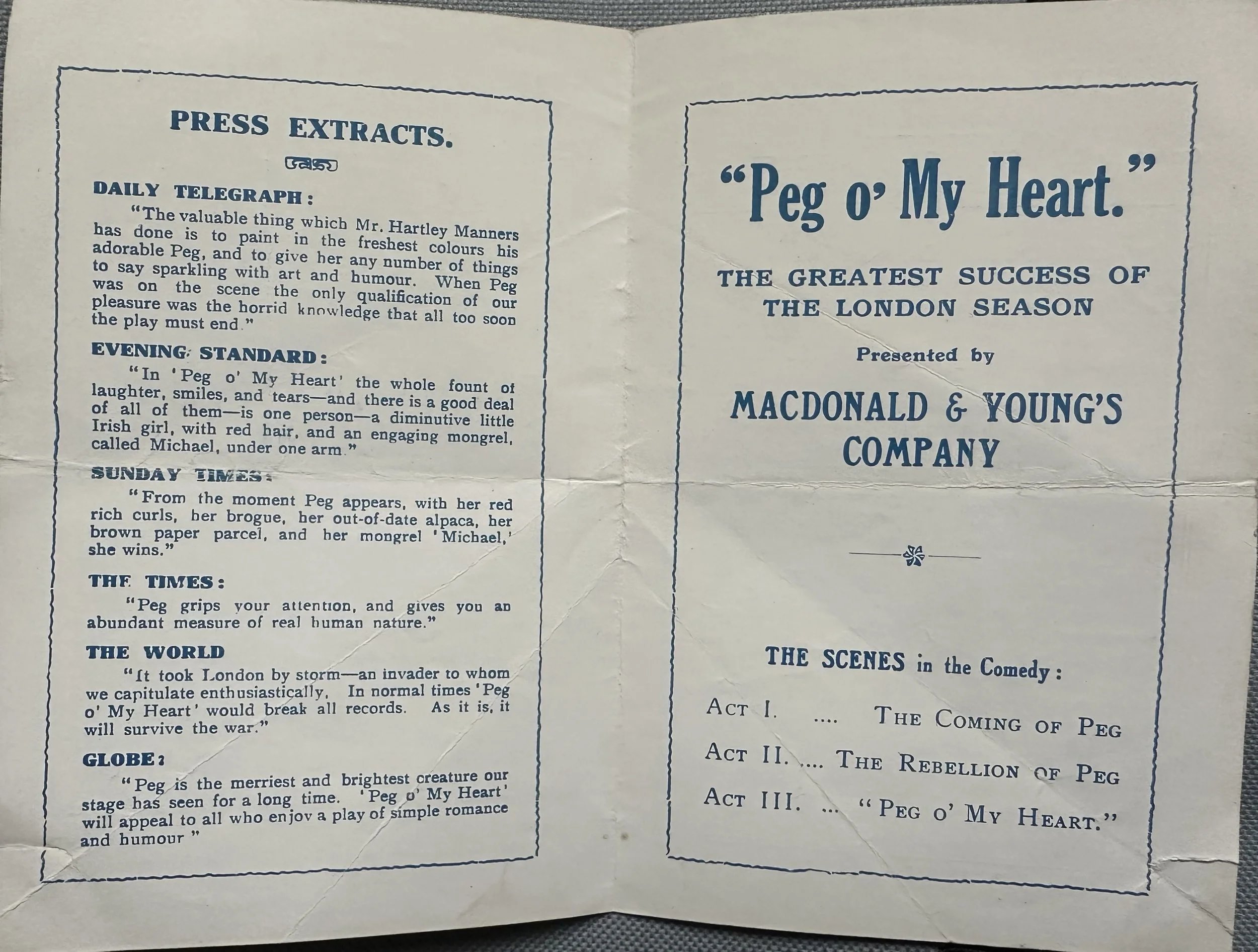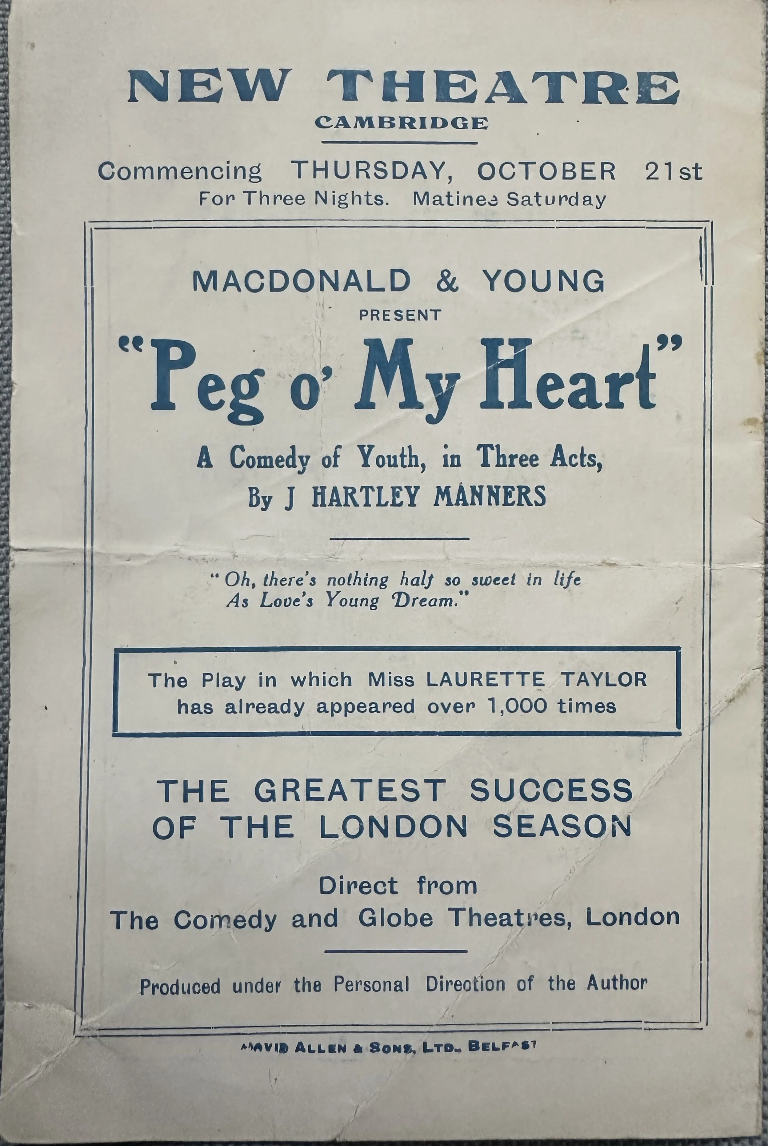 A theatre flyer from the New Theatre Cambridge c.1920's - for the play Peg O’ My Heart by J Hartley Manners. Presented by the MacDonald & Young’s Company.