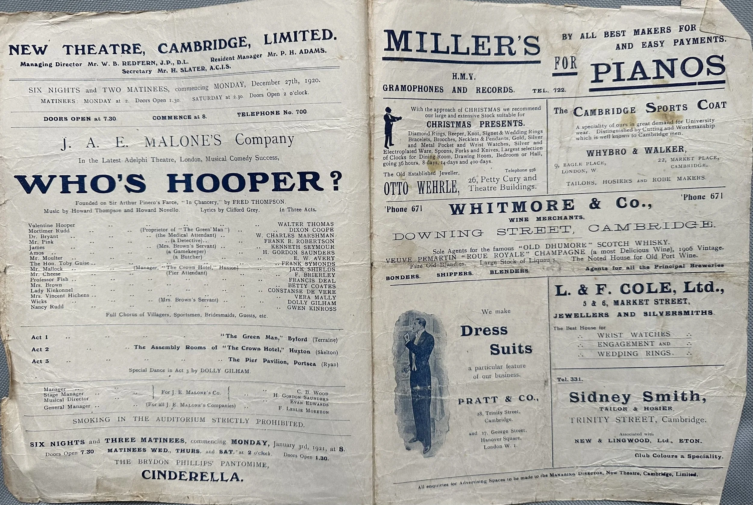This programme flyer from the New Theatre in Cambridge is for the week commencing 27th December 1920. The forthcoming production is to be ‘Who’s Hooper?’, a musical comedy to be performed by J A E Malone’s Company. Also promoted is the Pantomime ‘Cinderella’ to take place in January.