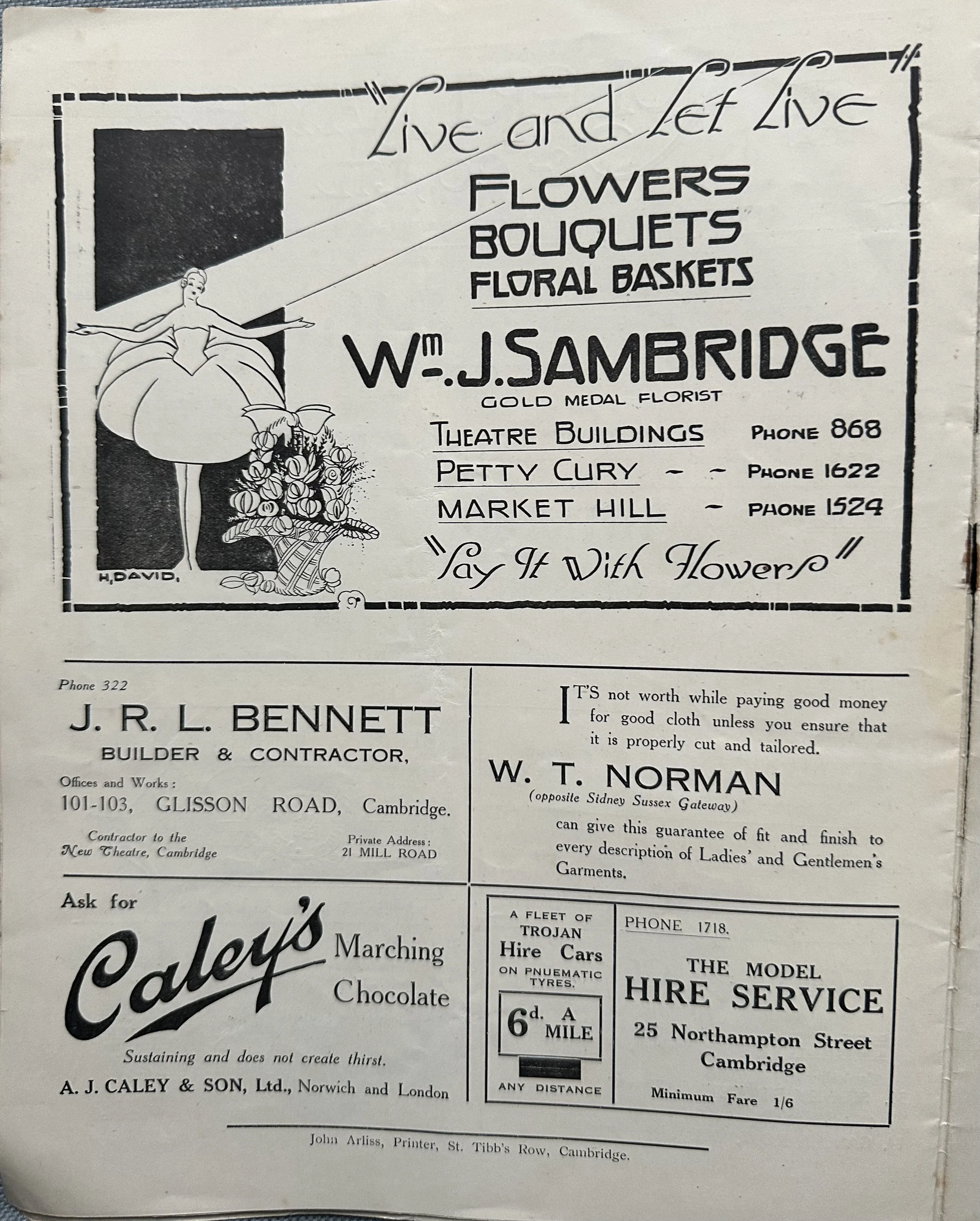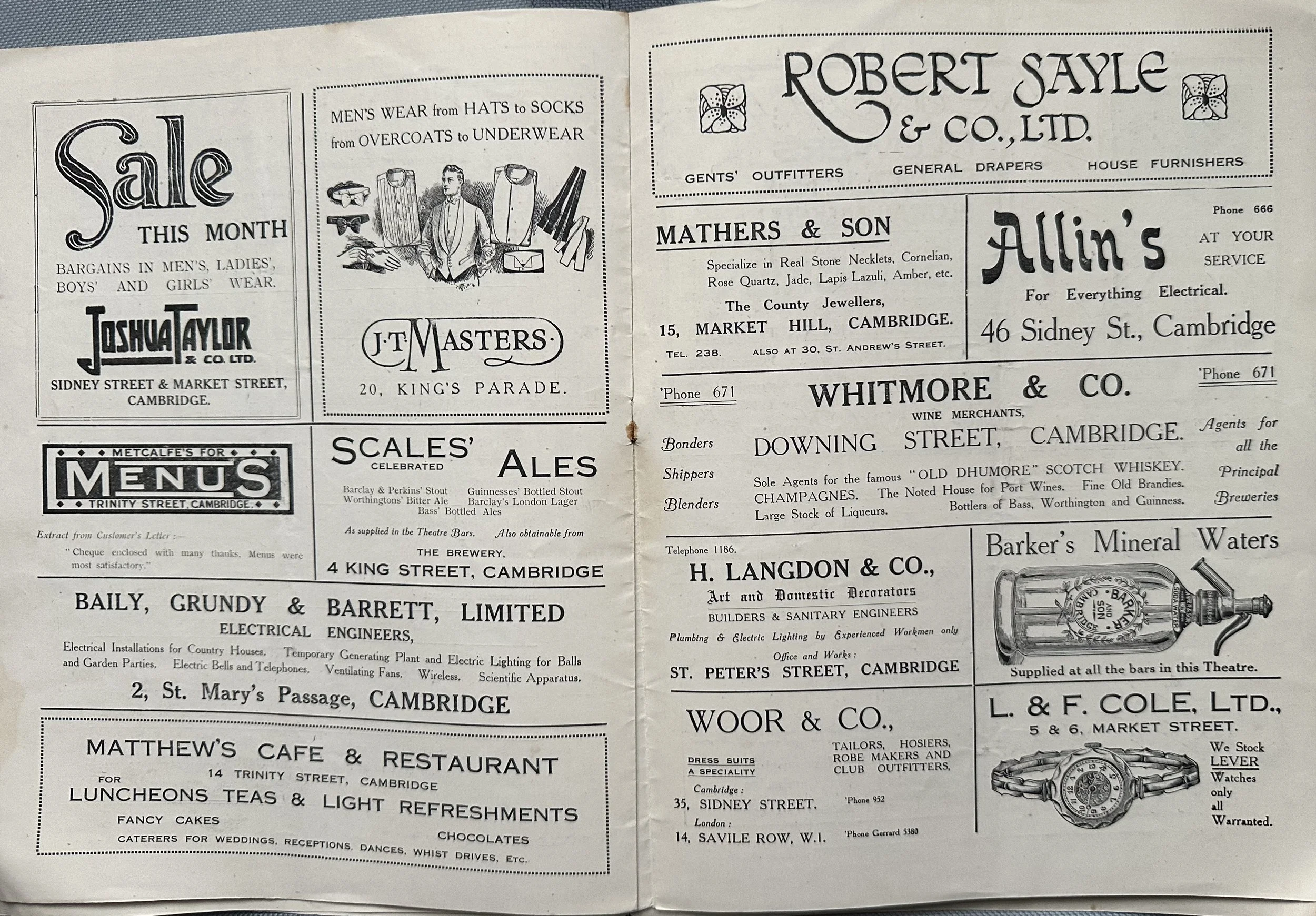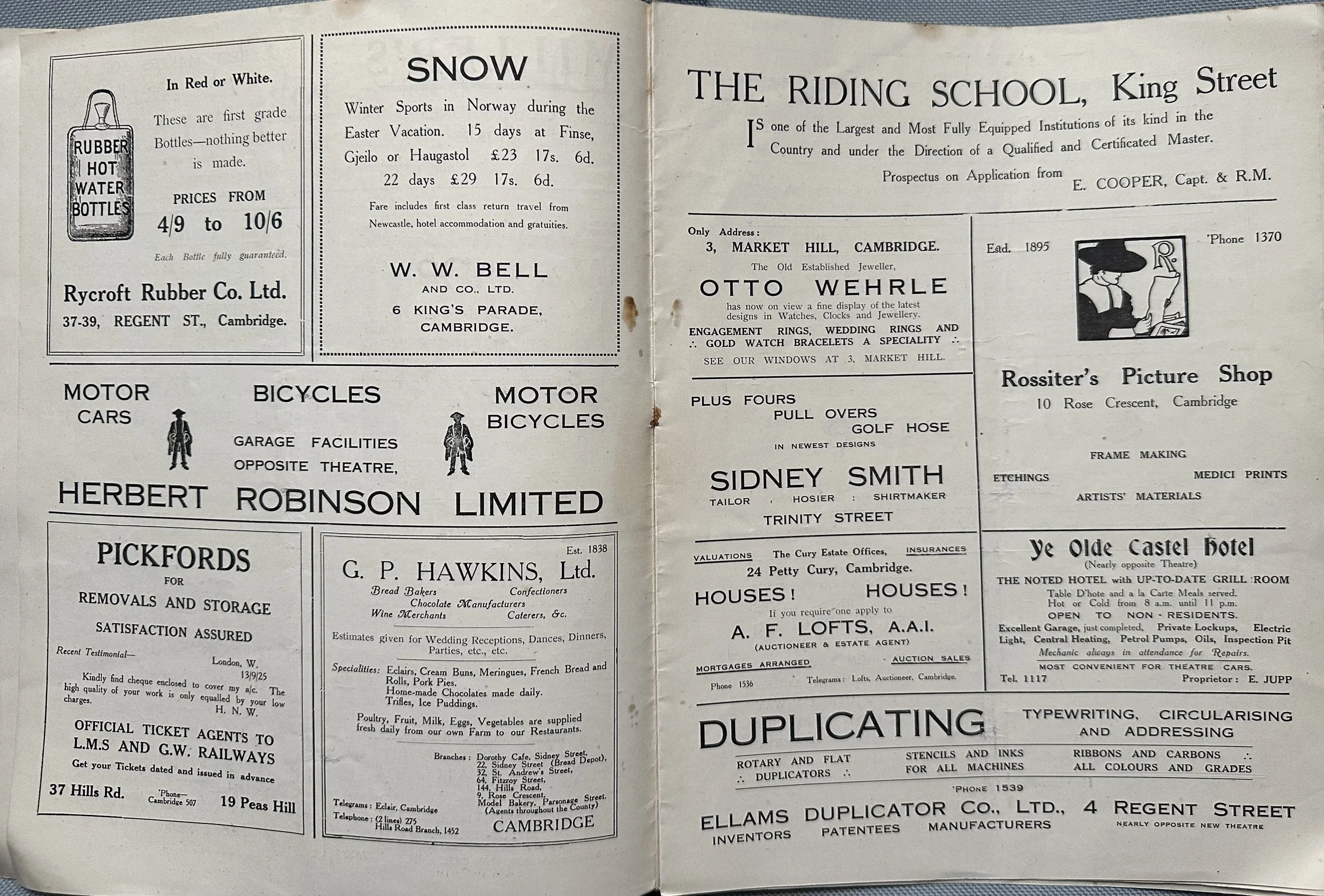 This programme flyer from the New Theatre in Cambridge is for the week commencing 15th February 1926. Included in the brochure are a good selection of advertisements from Cambridge businesses.