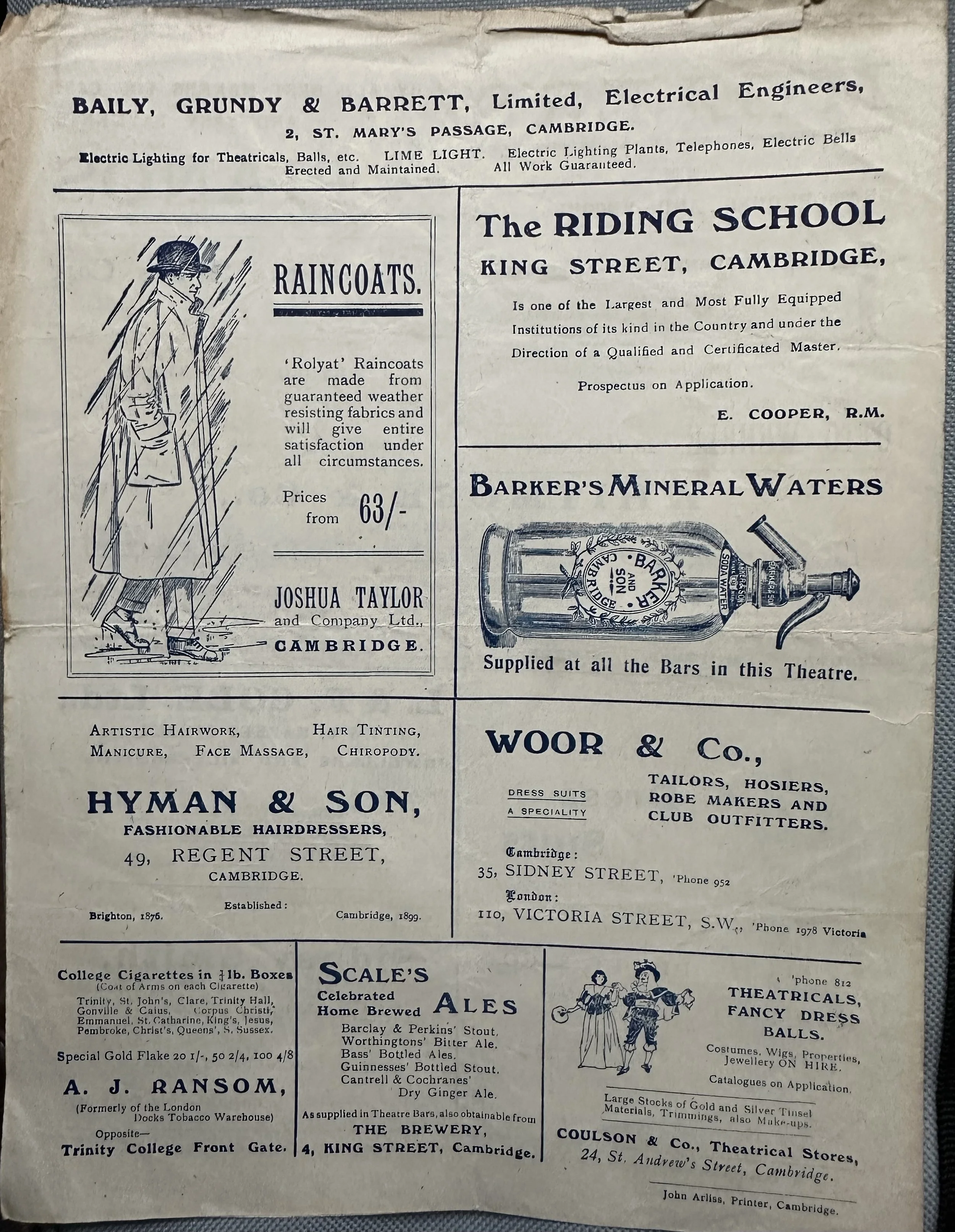 This programme flyer from the New Theatre in Cambridge is for the week commencing 10th January 1921. Included in the brochure are a good selection of advertisements from Cambridge businesses.