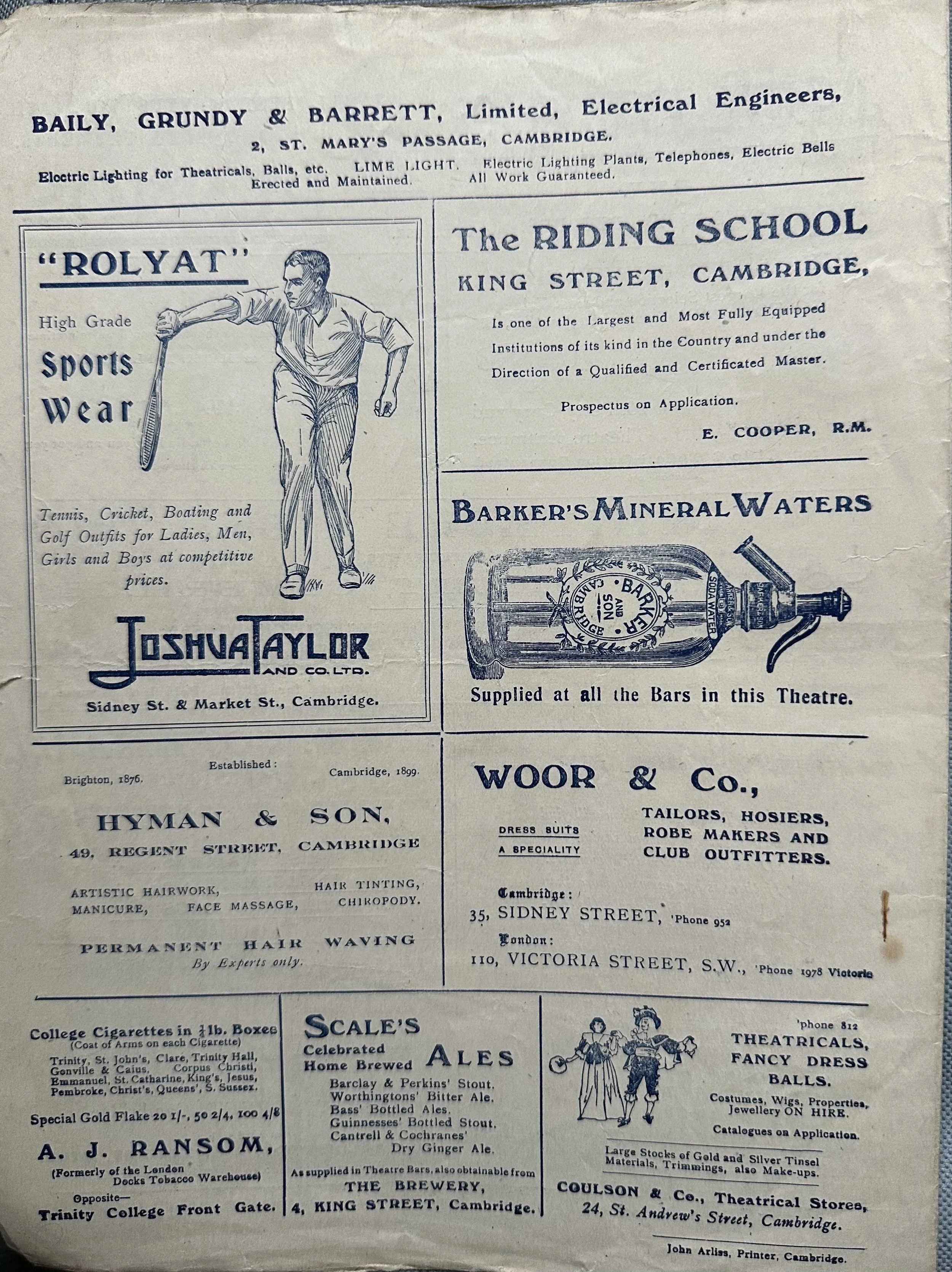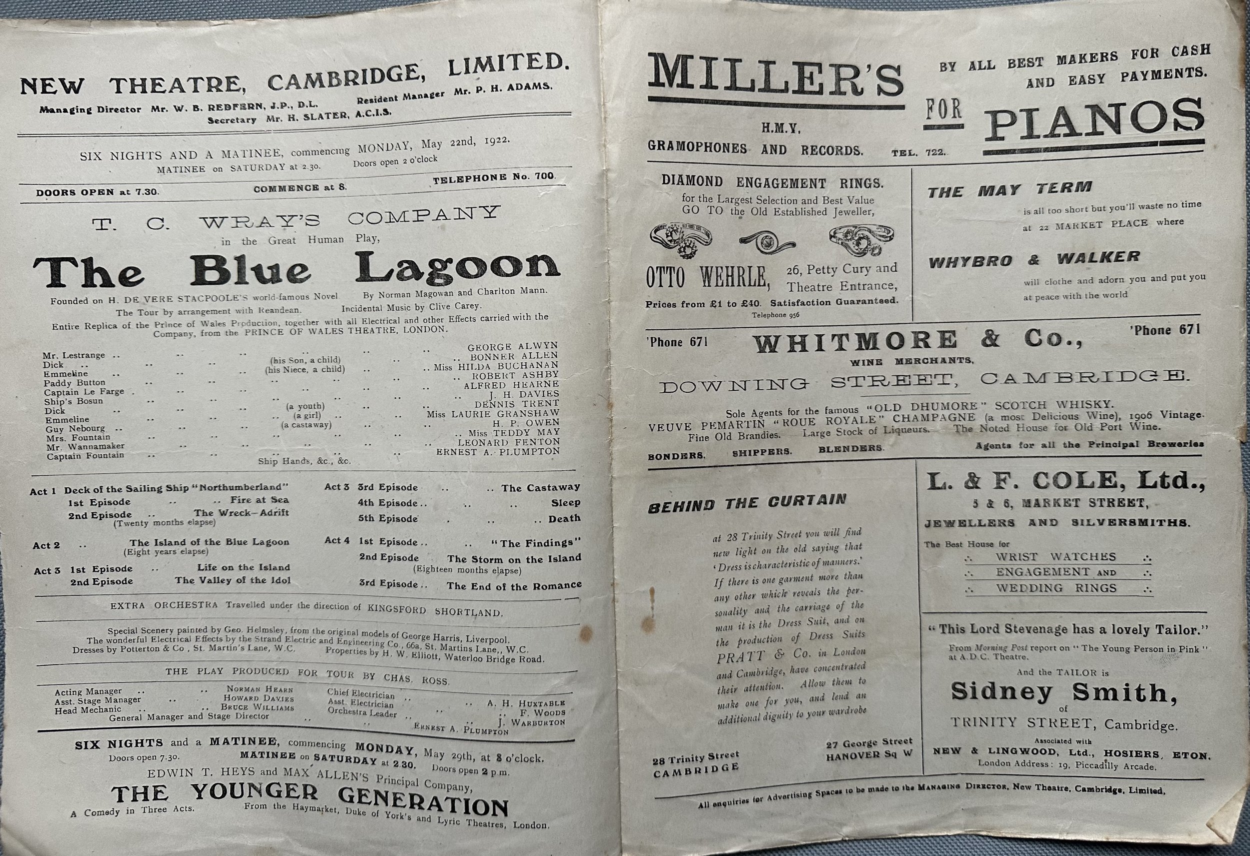 This programme flyer from the New Theatre in Cambridge is for the week commencing 22nd May 1922. Included in the brochure are a good selection of advertisements from Cambridge businesses.