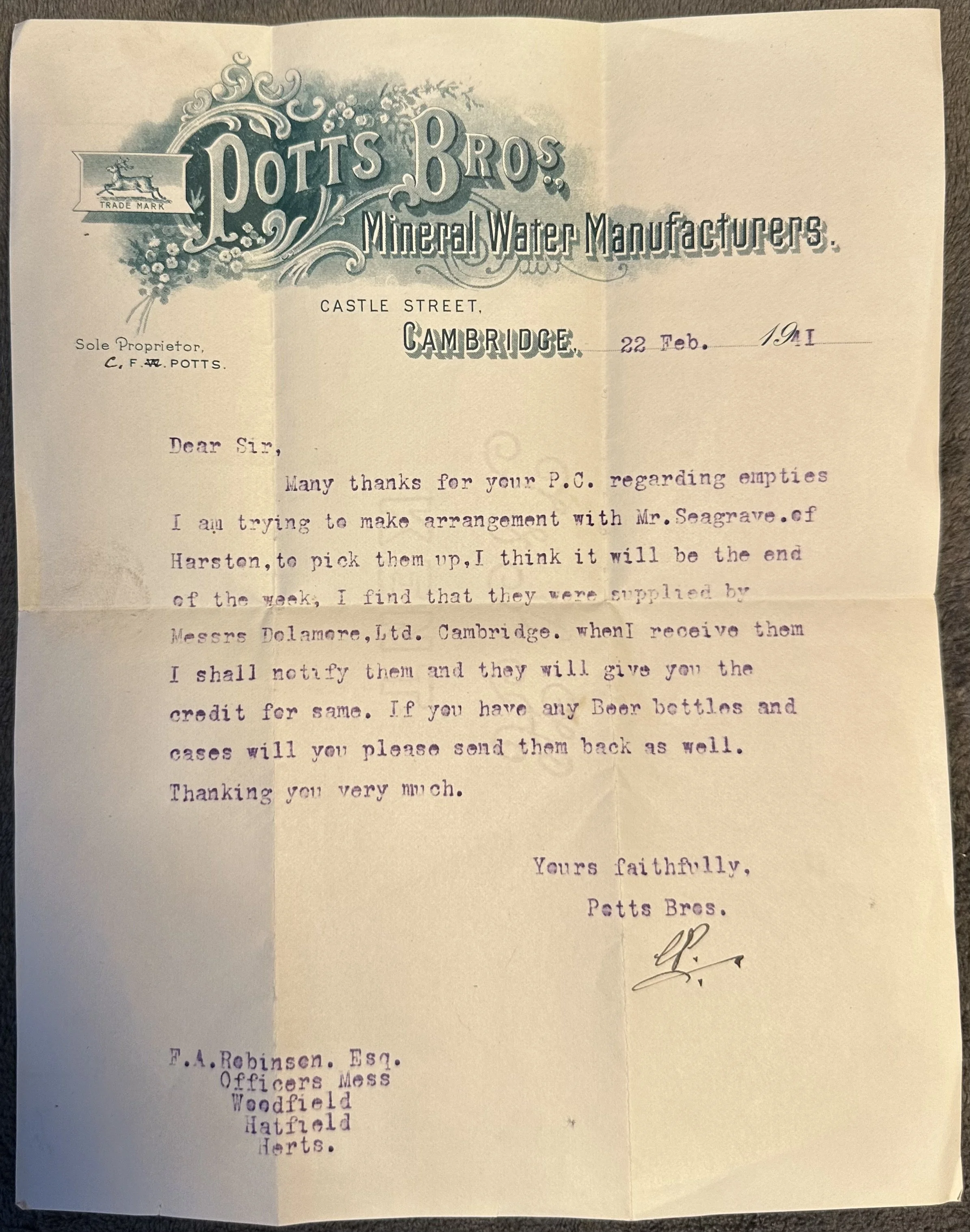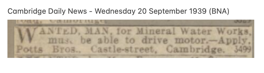 Potts Bros Mineral Water Manufacturers, Castle Street, Cambridge - letter 1941