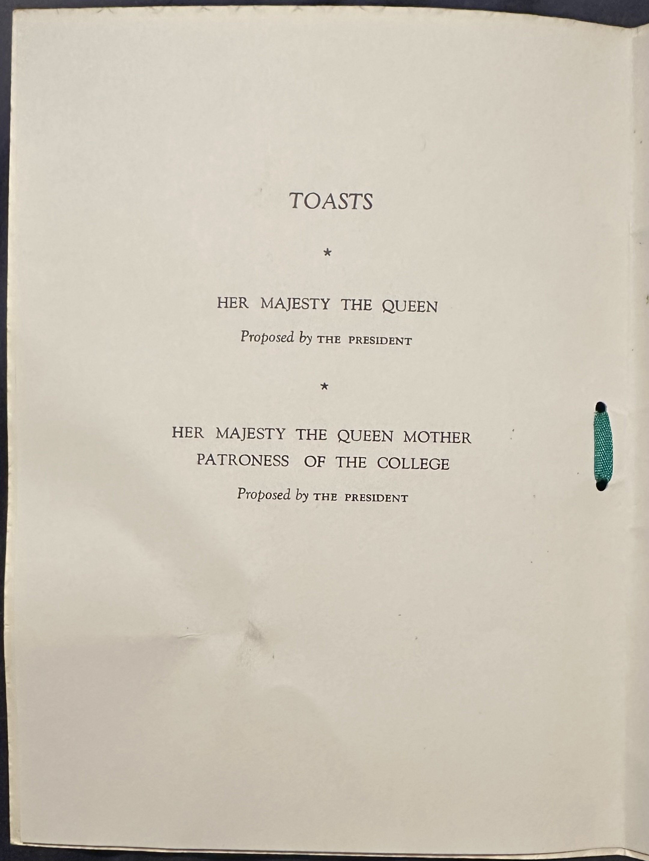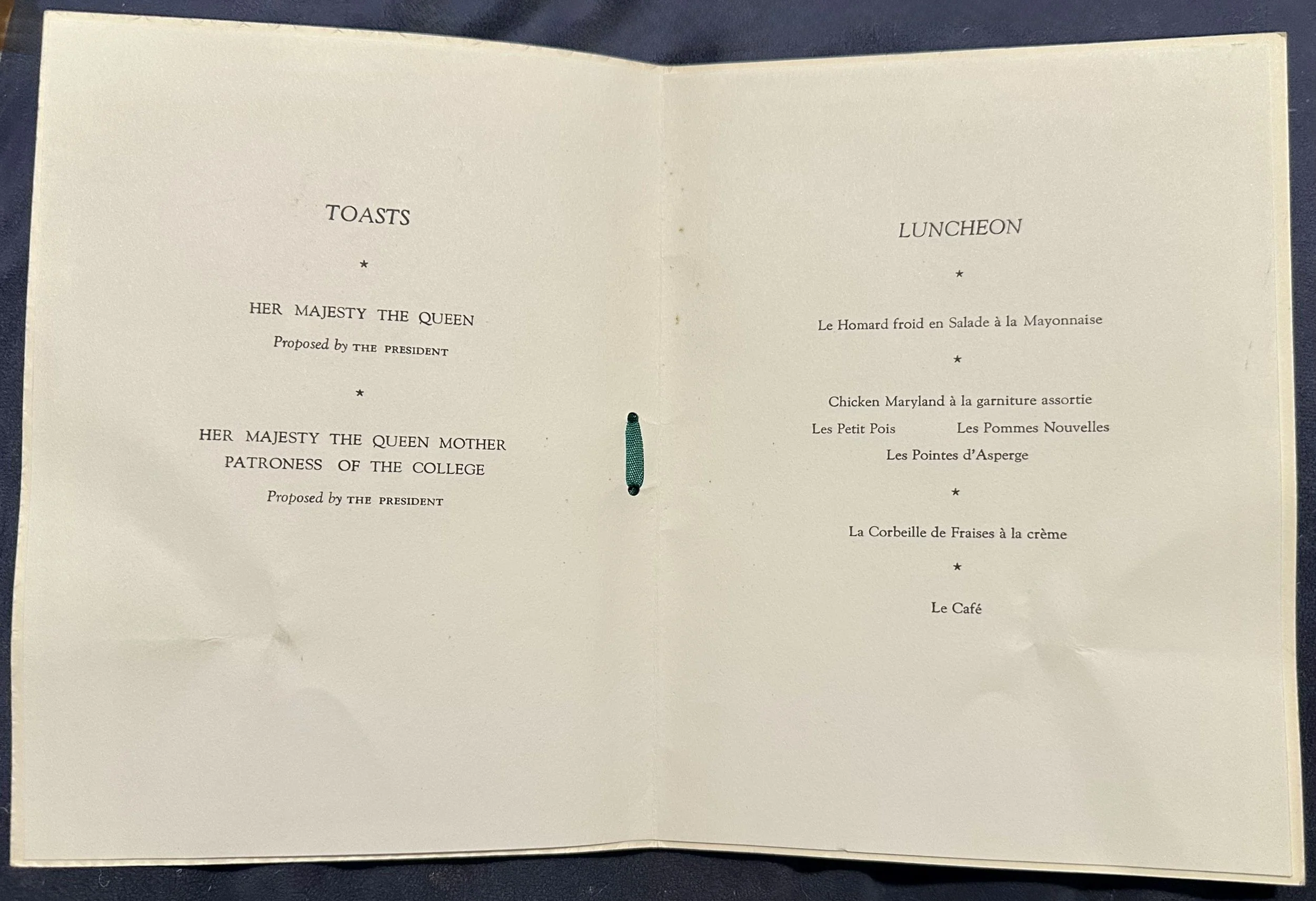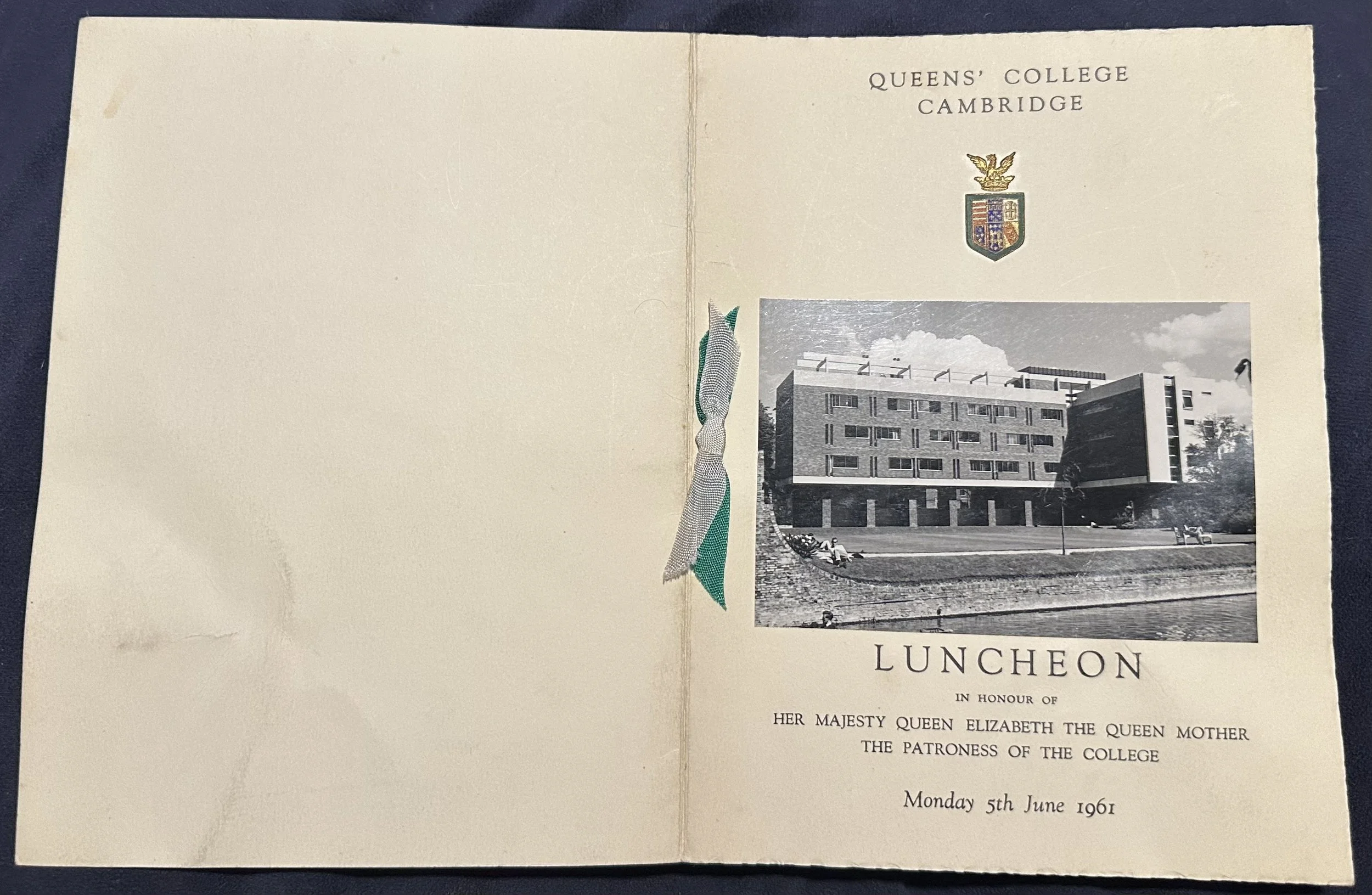 A lovely old Queens' College Cambridge Luncheon Menu for Monday 5th June 1961 which was held in honour of “Her Majesty Queen Elizabeth The Queen Mother The Patroness of The College”. There is a real black and white photograph placed on the front of the menu.