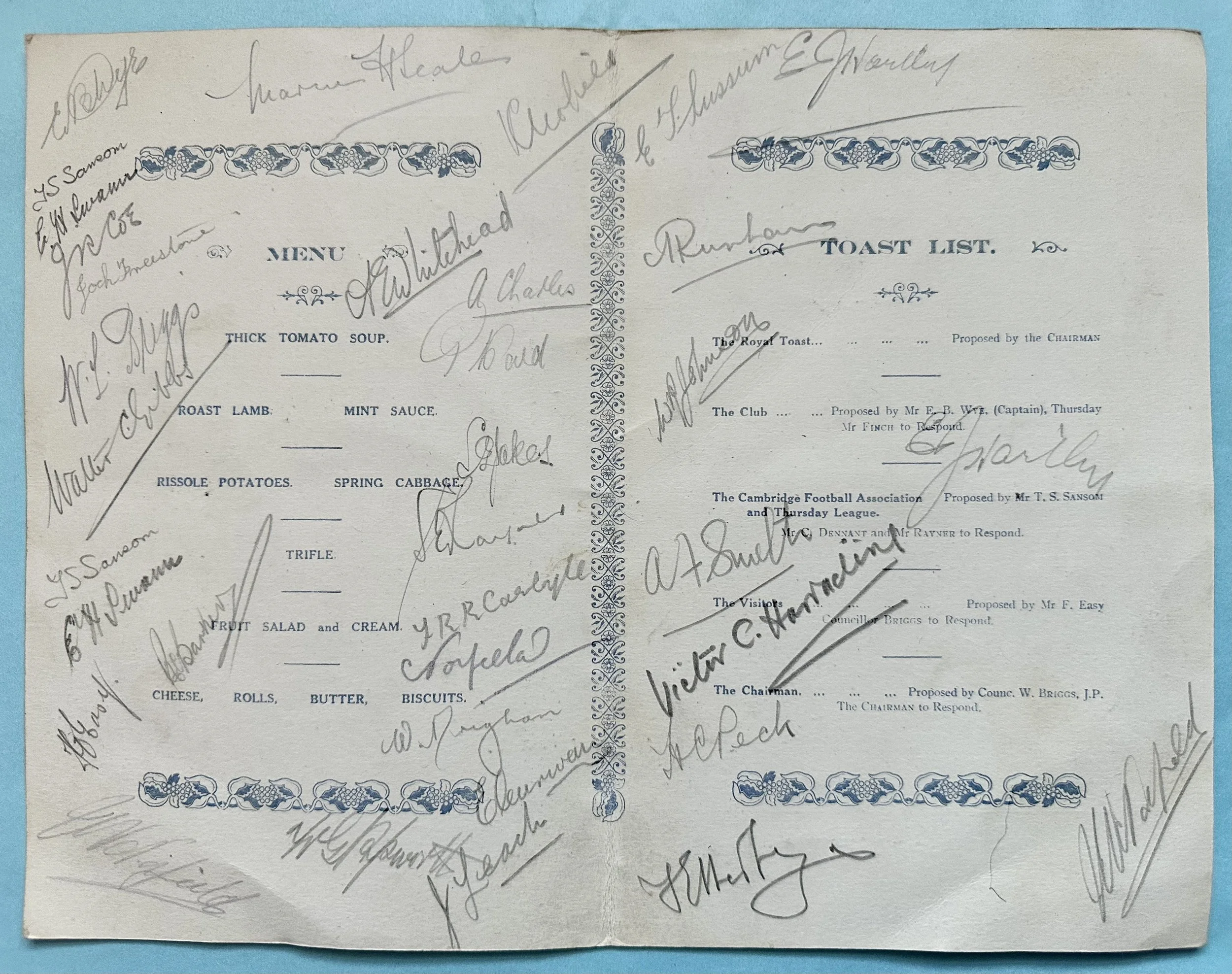 Inside you’ll discover that the two inside pages have been signed in pencil by members of the football club. I’ve tagged the names below where I could read them.