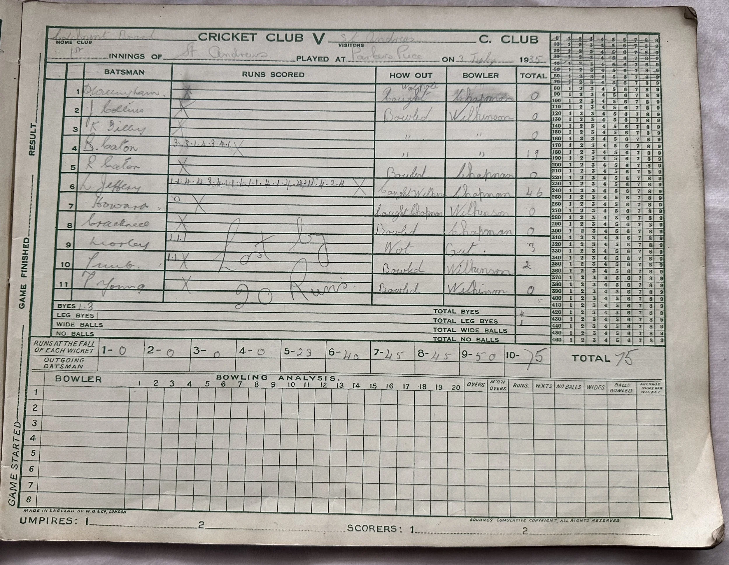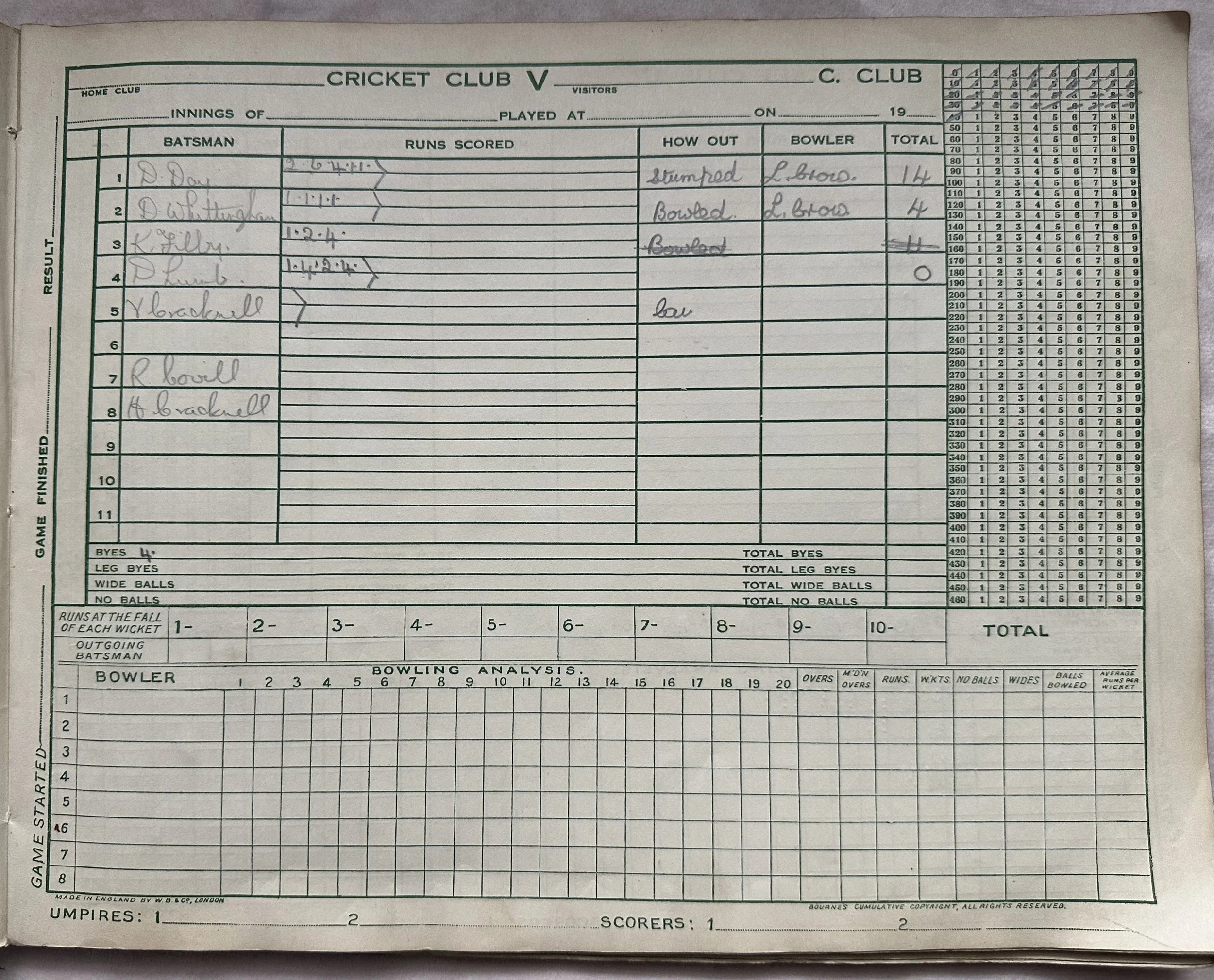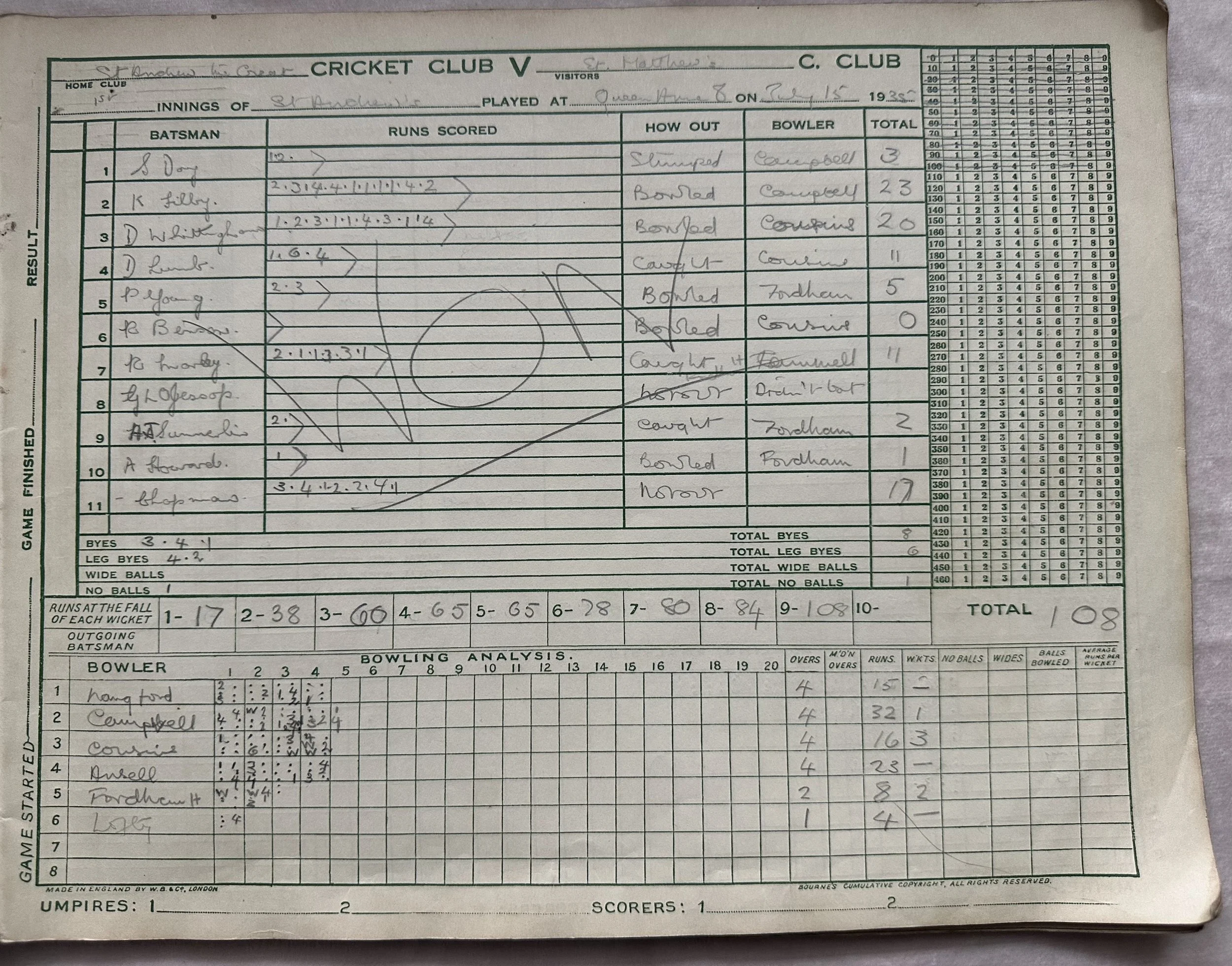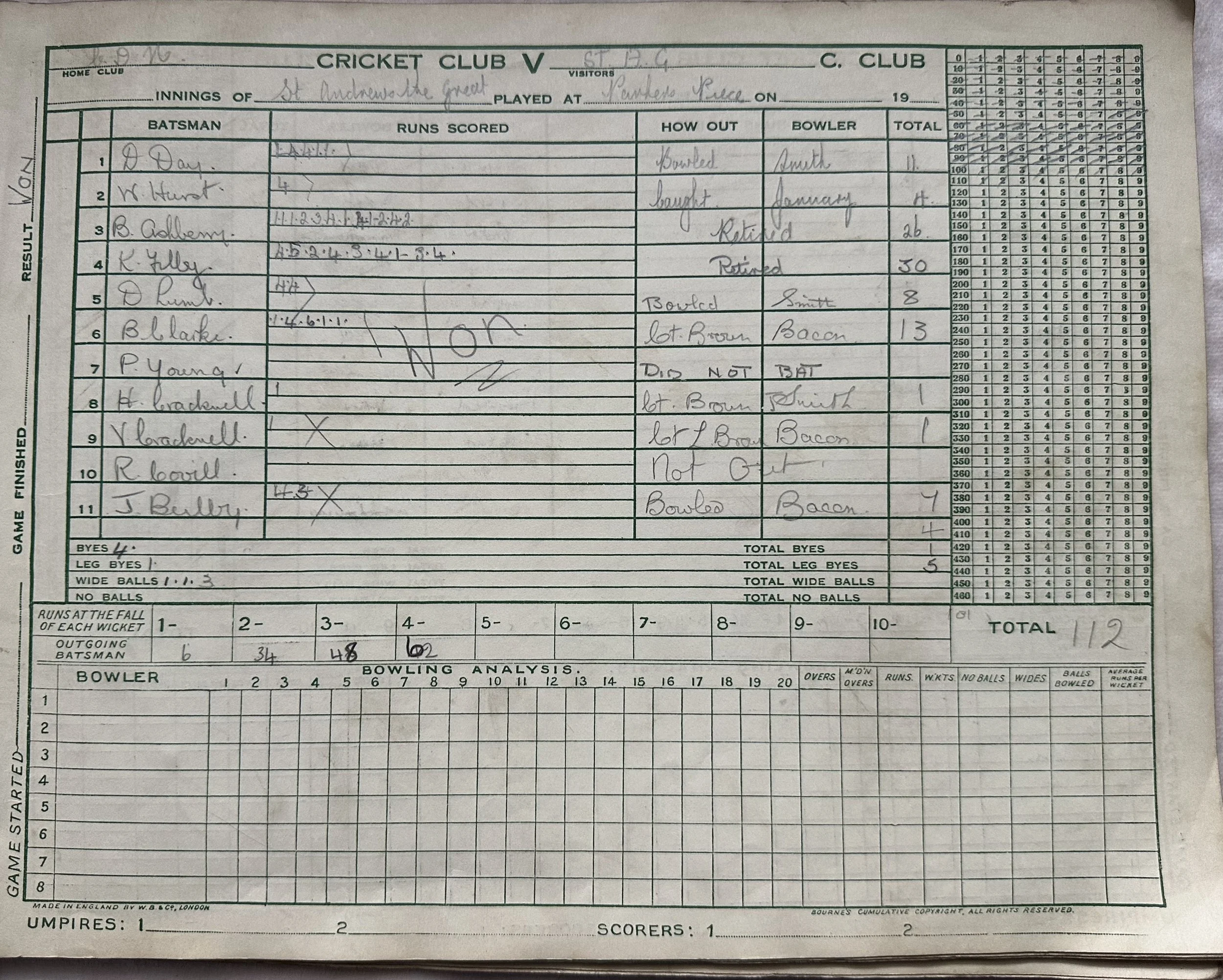 St Andrew’s The Great Fellowship Cricket Club Cambridge -Scoring Book 1935-1937 Season. It shows scoring, dates, and places of games, along with names of the players - a great bit of Cambridge history. There is another cricket scoring book for 1938 onwards, which is given in a following blog for later games.