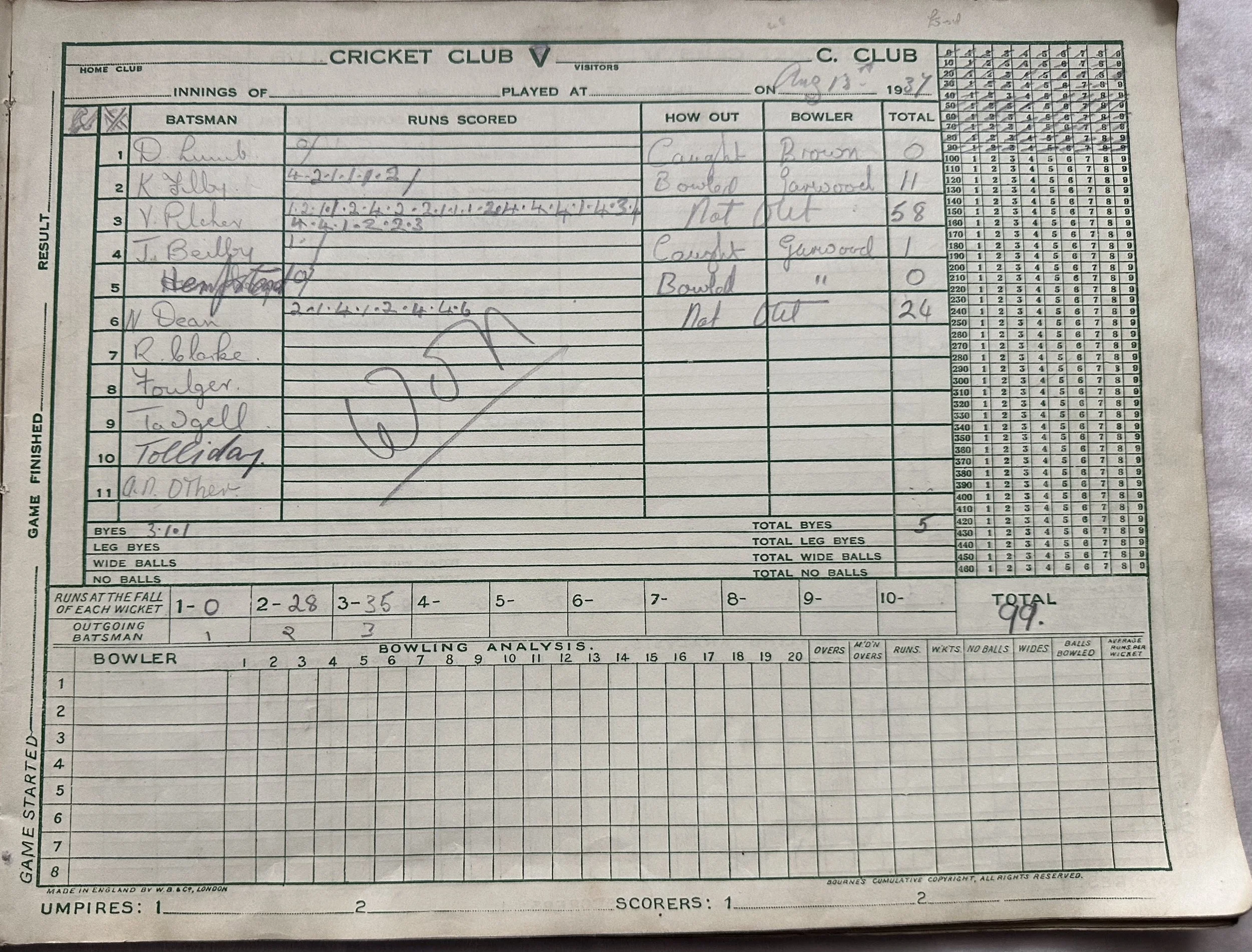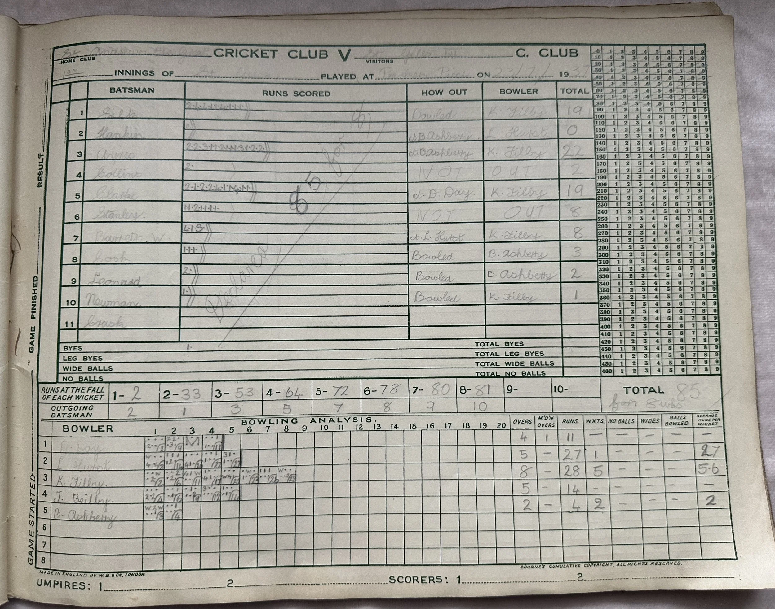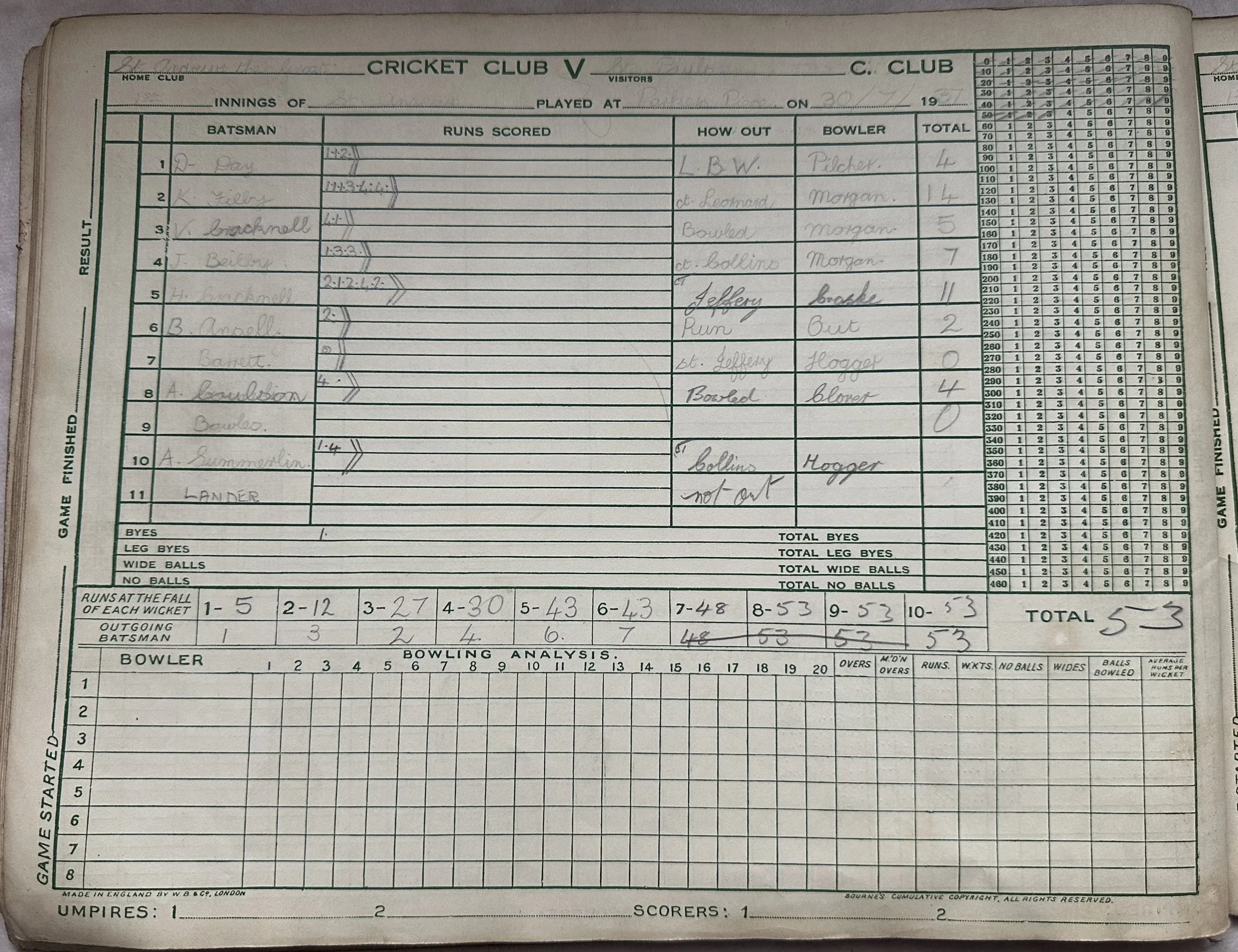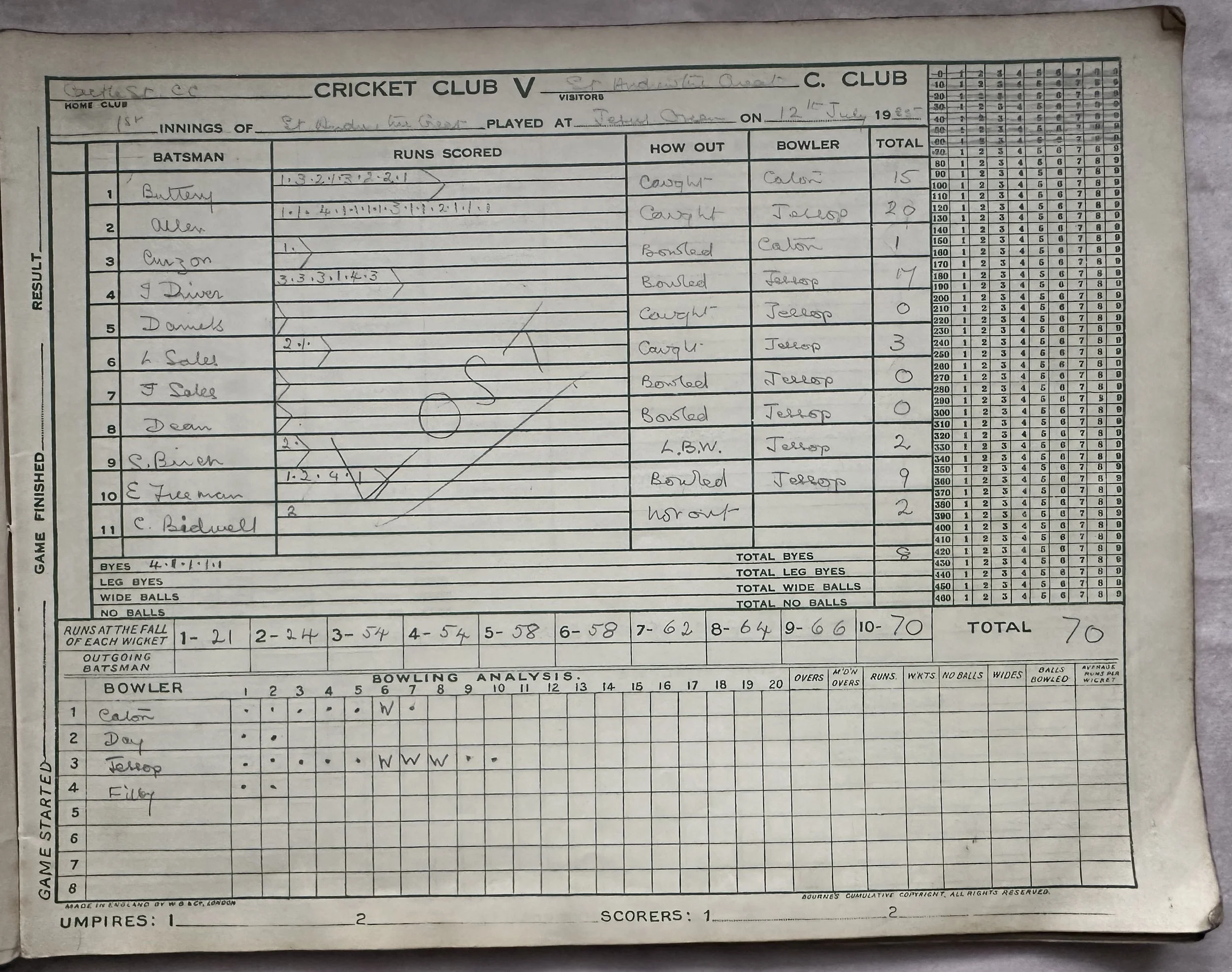 St Andrew’s The Great Fellowship Cricket Club Cambridge -Scoring Book 1935-1937 Season. It shows scoring, dates, and places of games, along with names of the players - a great bit of Cambridge history. There is another cricket scoring book for 1938 onwards, which is given in a following blog for later games.