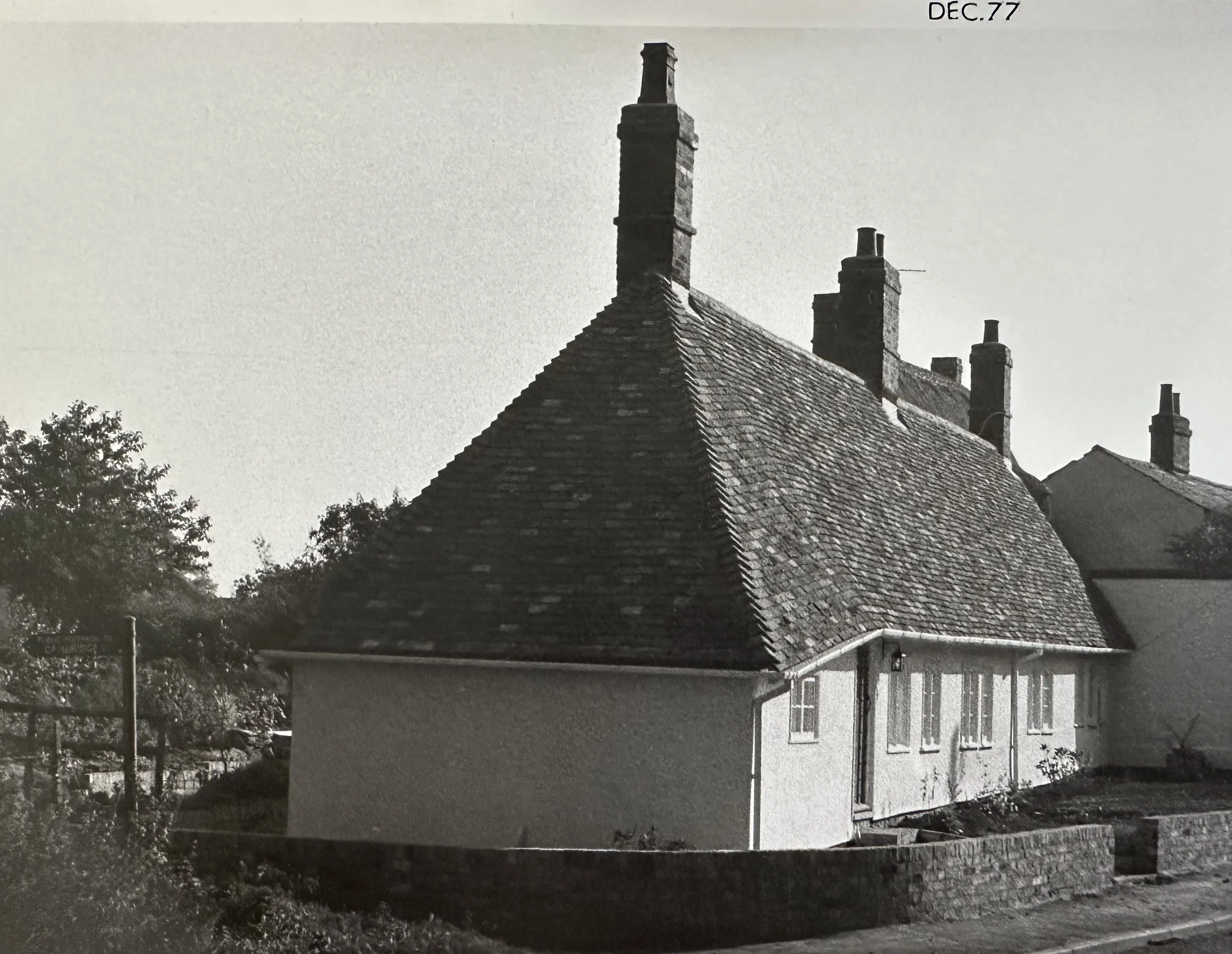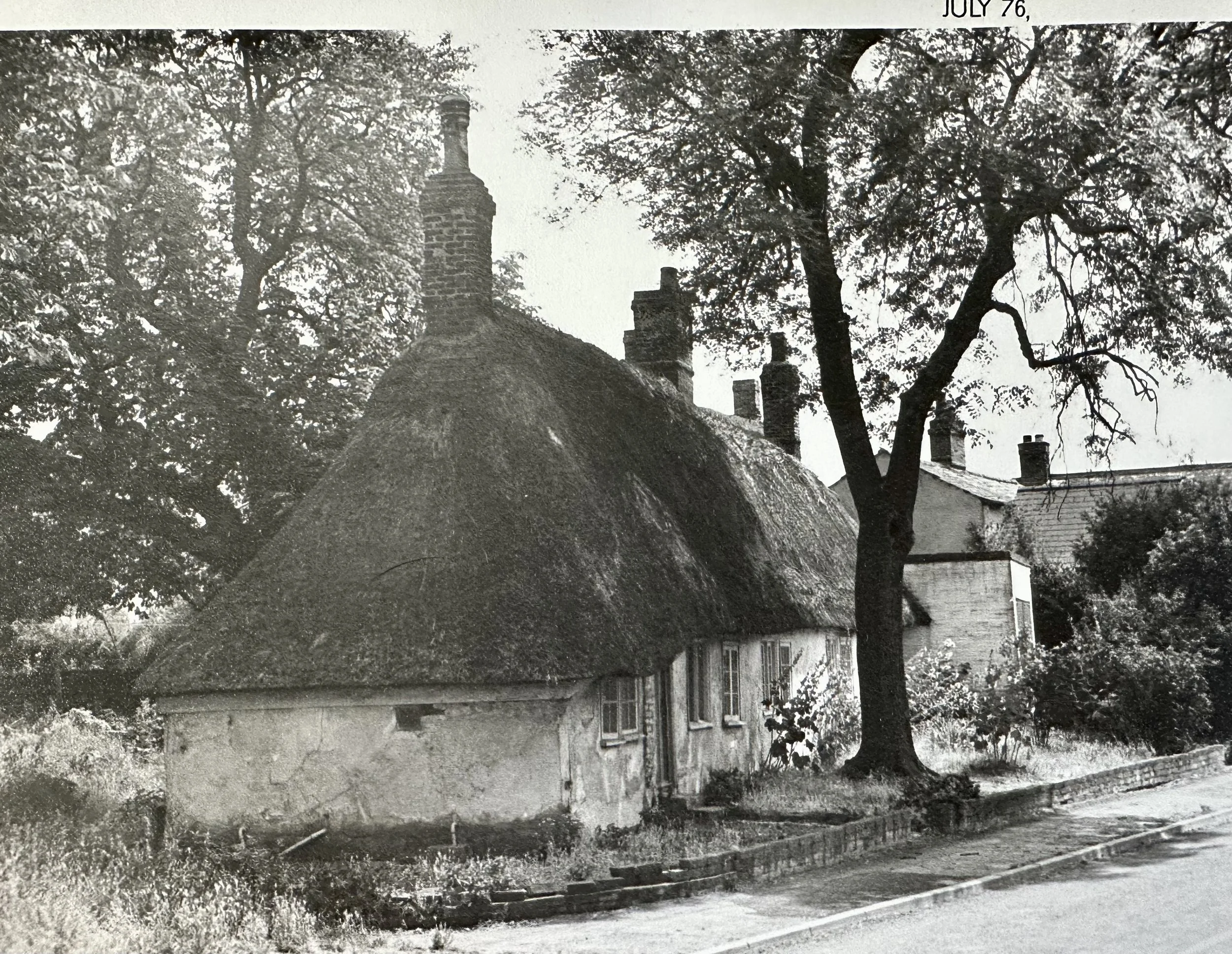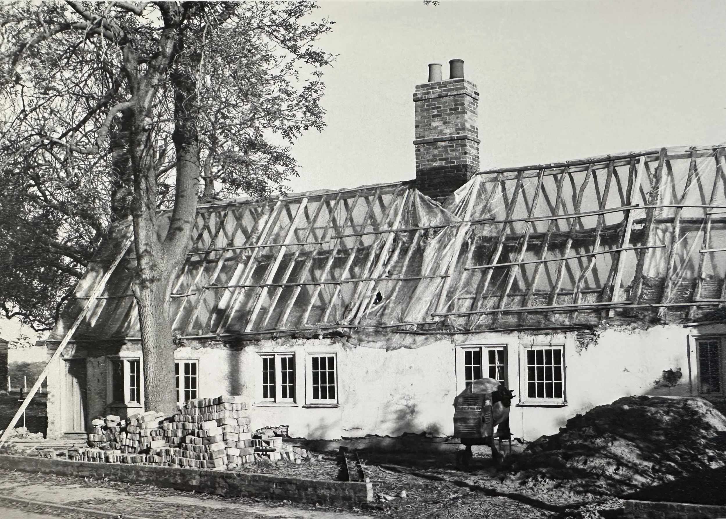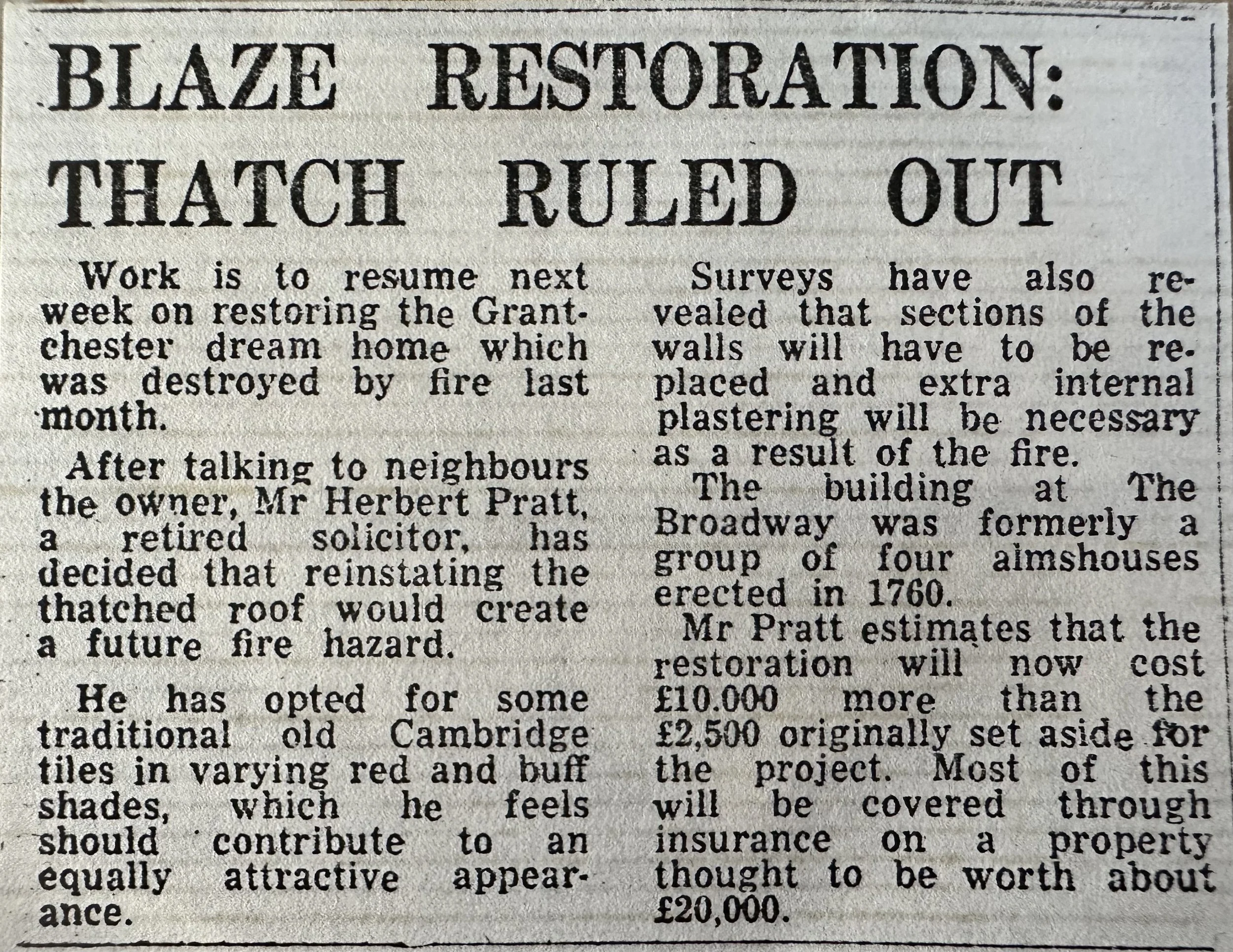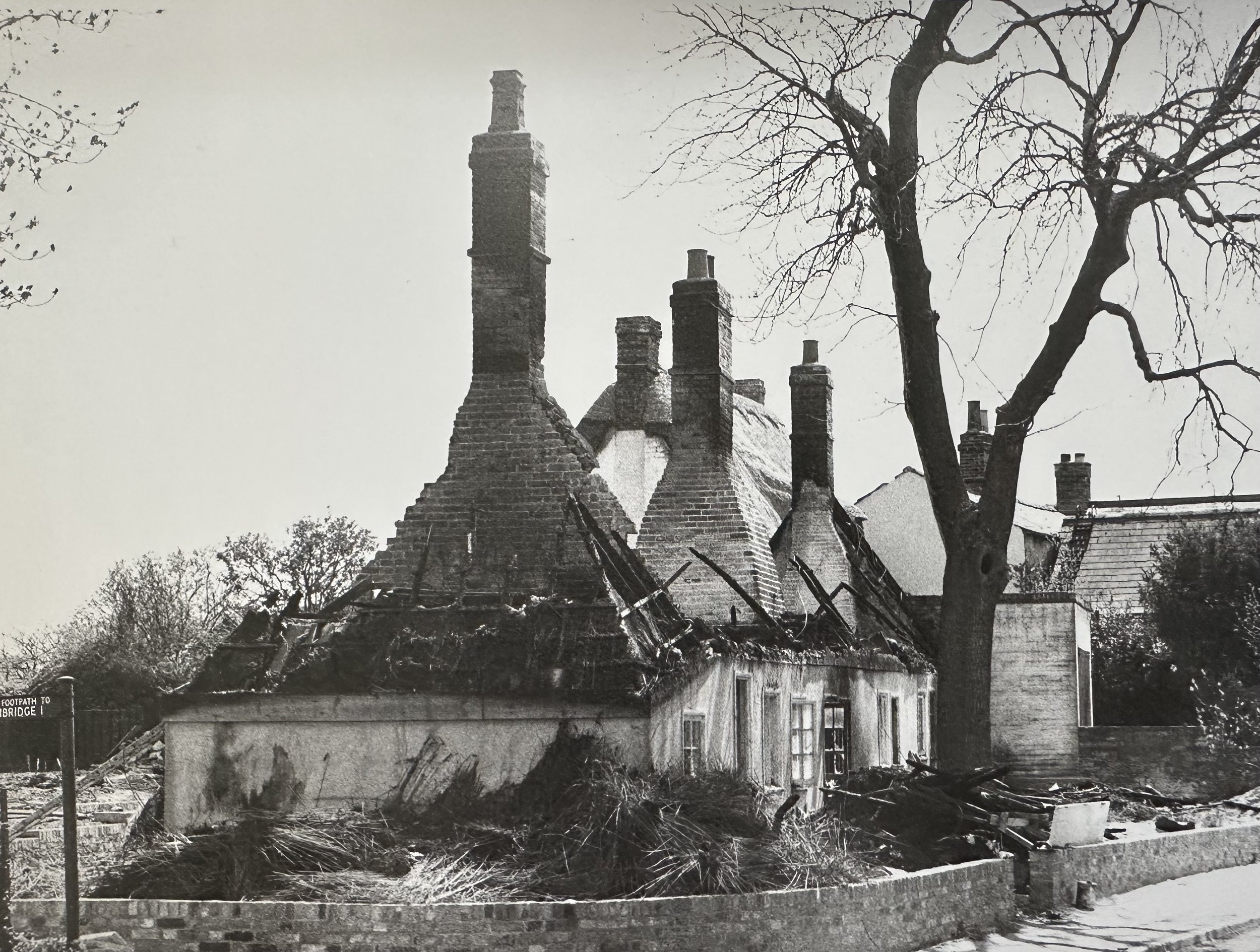 Below are a collection of photographs taken by Colin Bass of the Alms Houses in Grantchester between. You can see the original thatch in the first photographs. Then, in the spring of 1977 there was a very bad fire the results of which you can see below. By December 1977 the Alms Houses were restored but now with a titled roof.