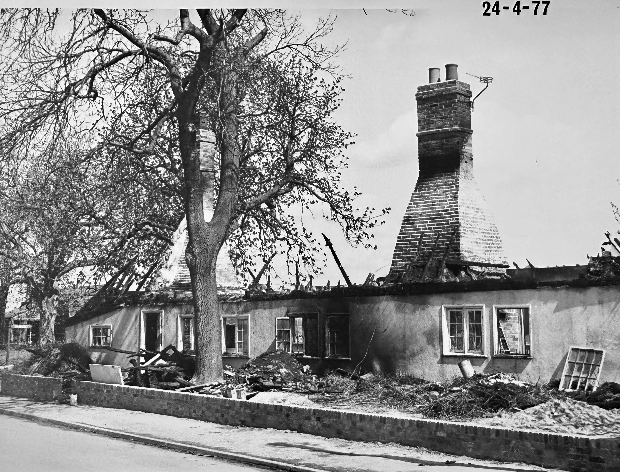 The Alms Houses Grantchester April 1977 - just after the fire (Colin Bass)