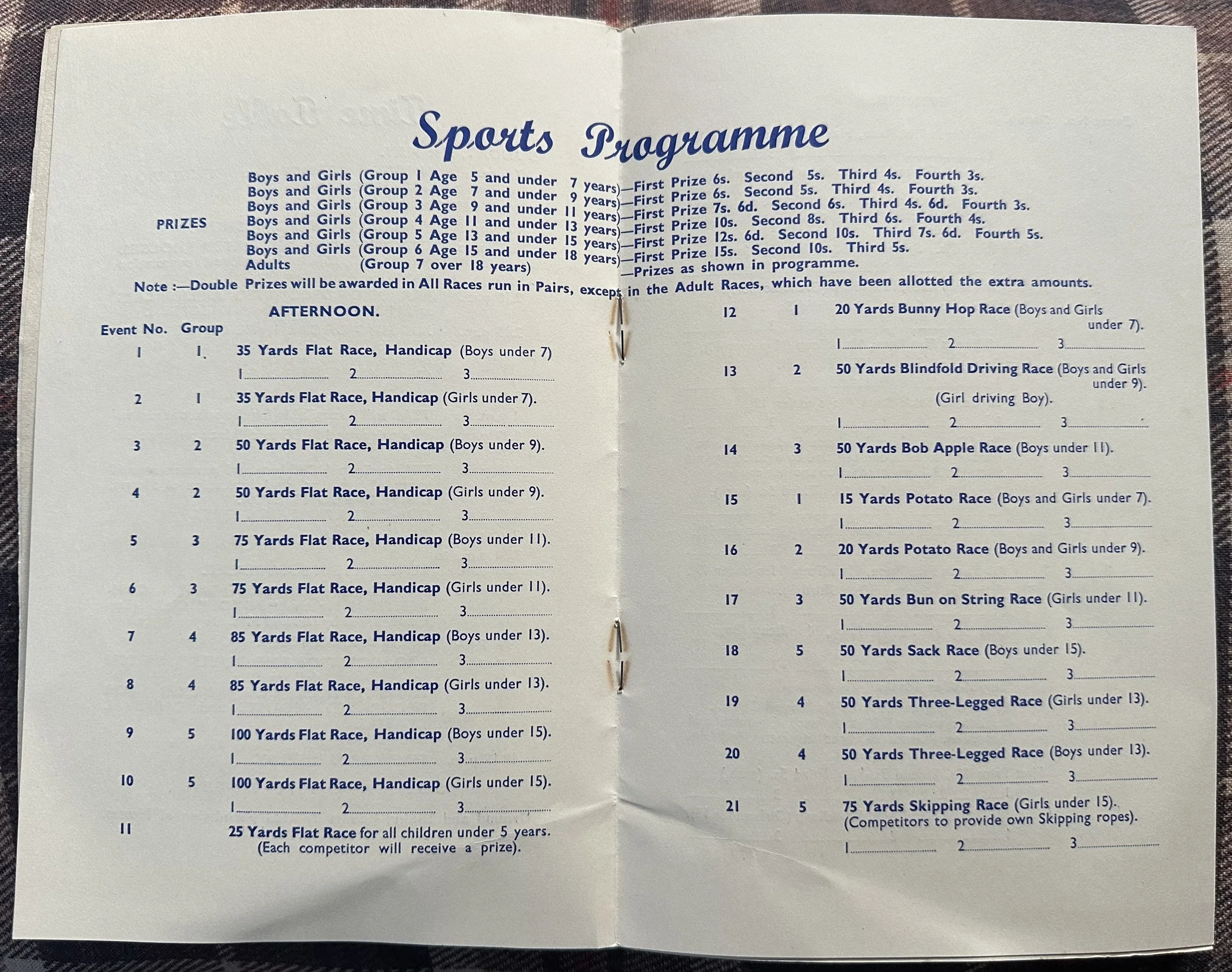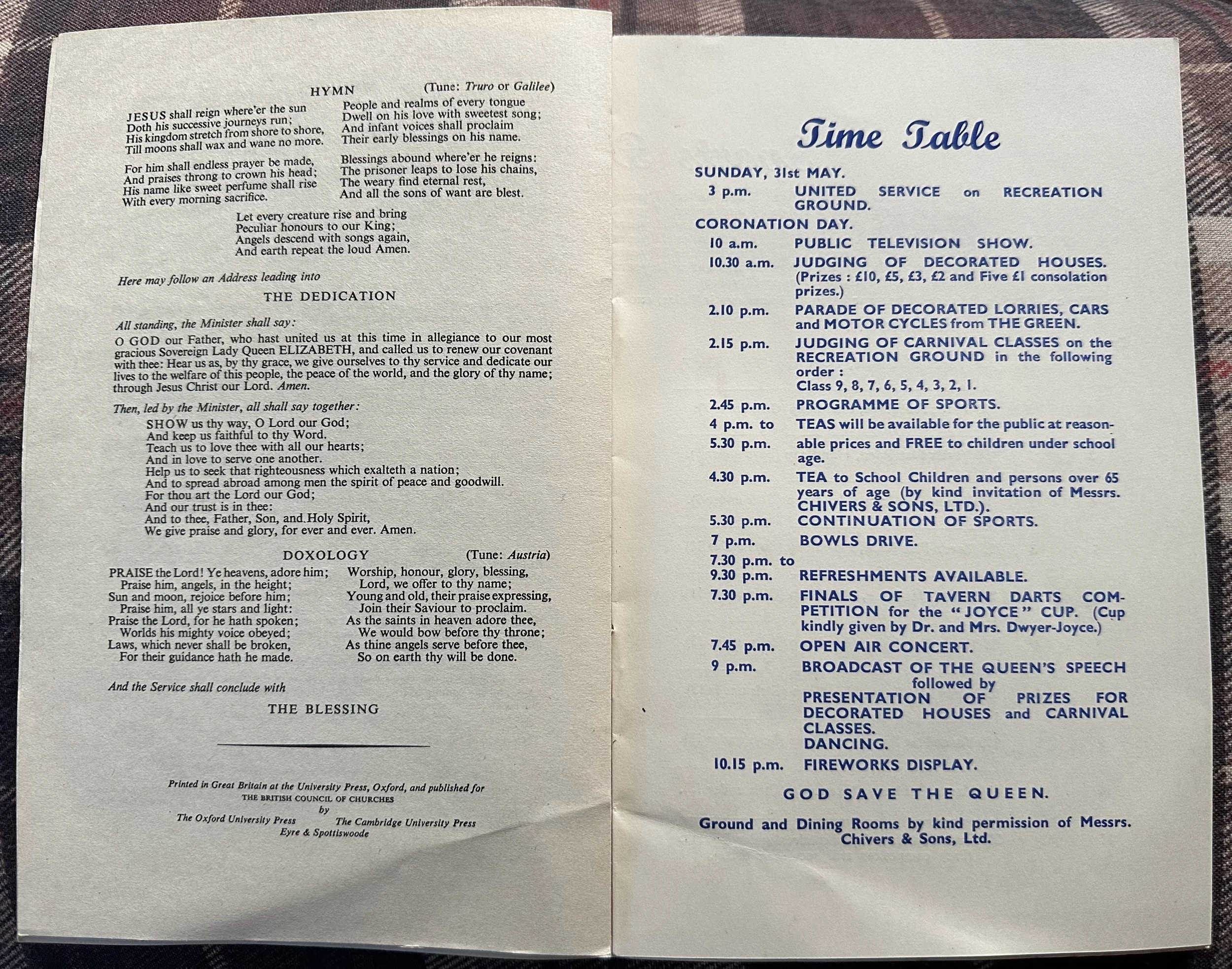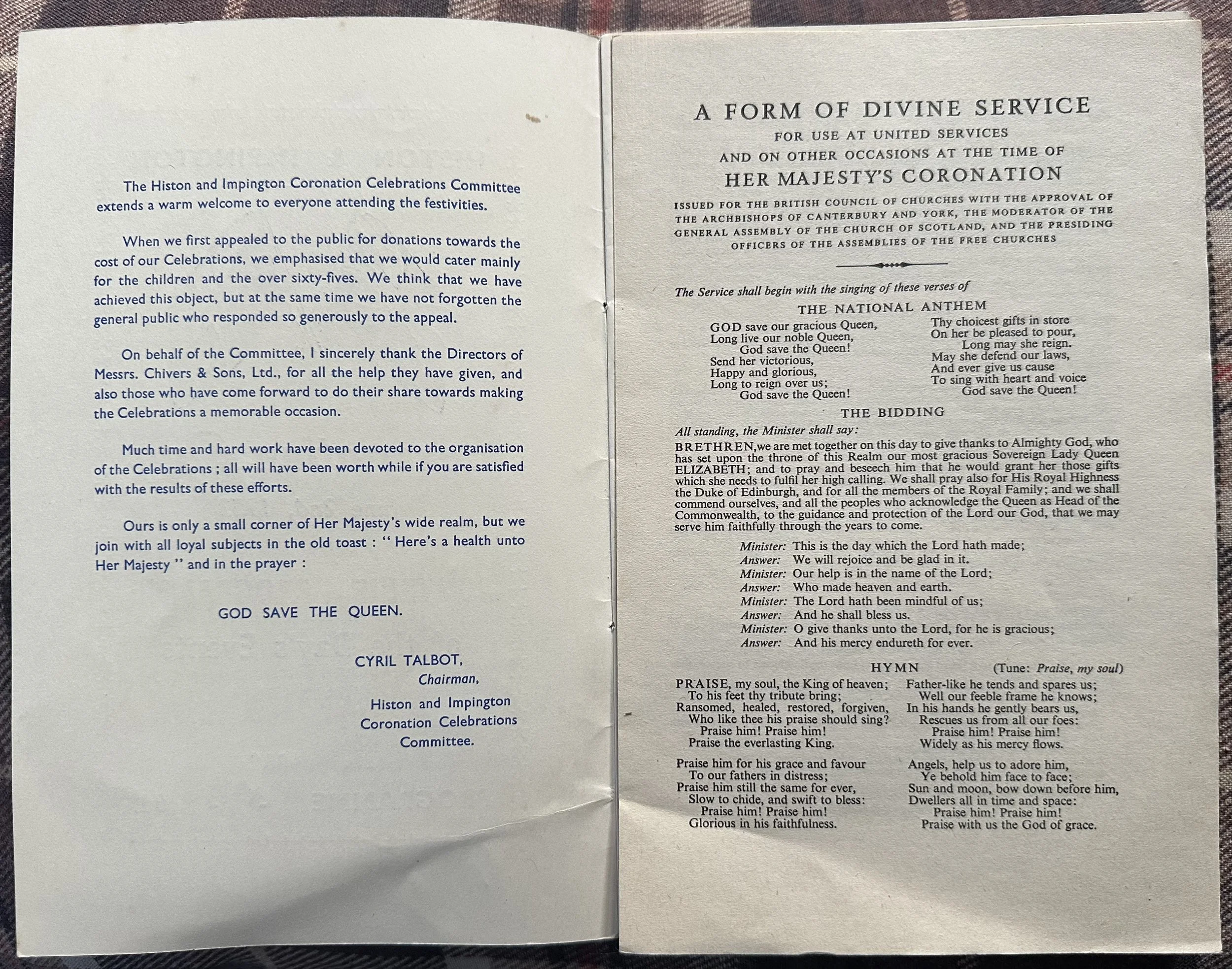This is a lovely slight cream coloured heavy weight paper folded souvenir programme, numbered 682 (I wonder how many were produced and how many people must have attended) dated June 2nd 1953 for Histon and Impington celebrations of Queen Elizabeth II Coronation Day. There is included a thinner folded paper insert of ‘A Form of Divine Service’.