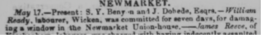 Why he would choose to damage a window in the Newmarket workhouse is a mystery, was this from the outside in or was he having stay there and damaged the window from inside? Also where was he committed for seven days to?