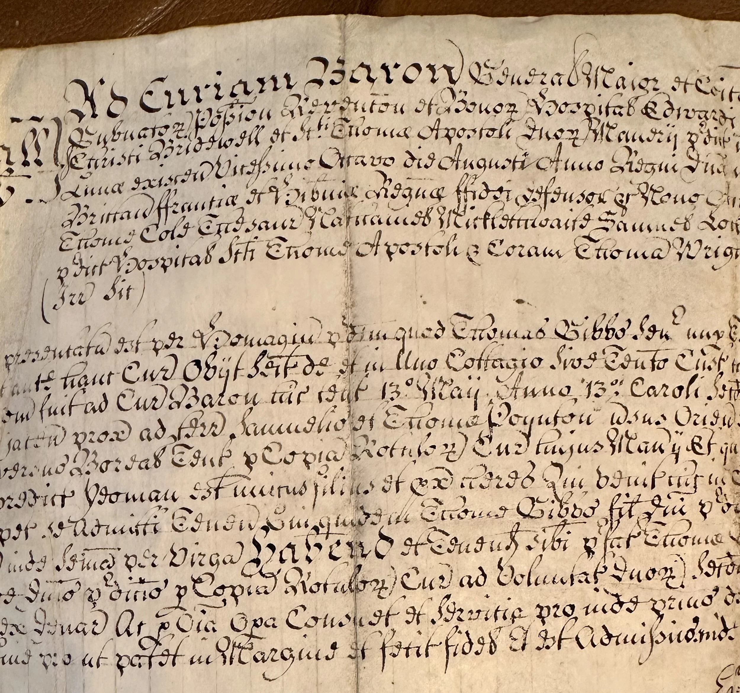 Ad Curiam Baron[is] Edwardi Mayor Ar[migeri] tent[am] ibidem pro dicto Cur[ia] Baron[is] ibidem die Martis vicesimo septimo die Maij Annoq[ue] D[omi]ni 1661 Annoq[ue] Regni D[omi]ni n[ost]ri Caroli Secundi dei gratiâ Angl[iae] &c decimo tertio coram Tobiâ Hughes generoso Senescallo ibidem.