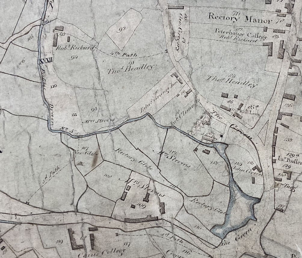 The nature of the tenure of the land is interesting. John Green’s land is a copyhold from the manor of Hinton Rectory. Peterhouse College is renting out some of its land. There is an associated change in land use on the north side of Spring Head with the construction of cottages, homesteads, outbuildings and orchards.