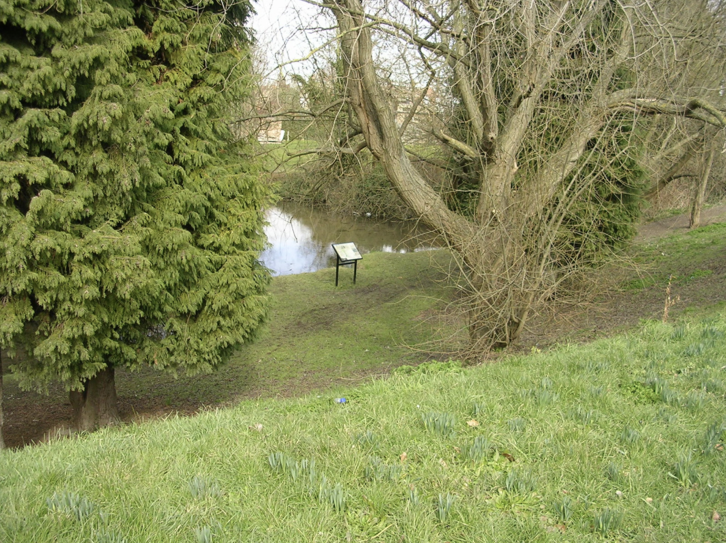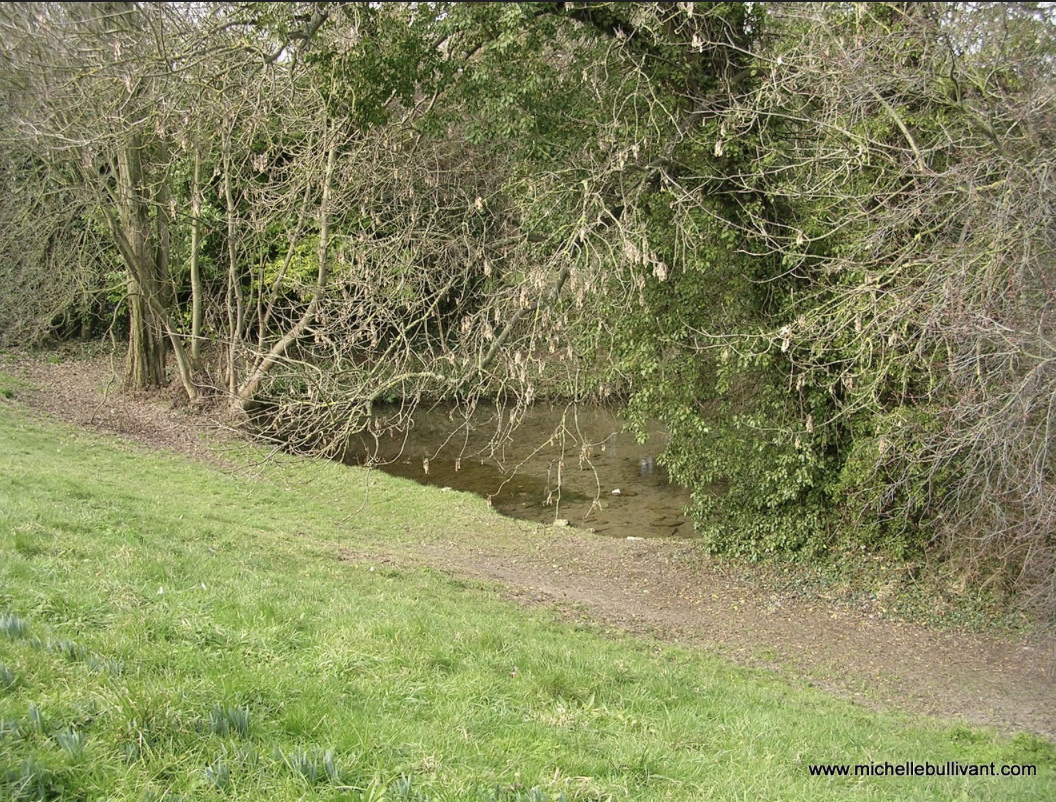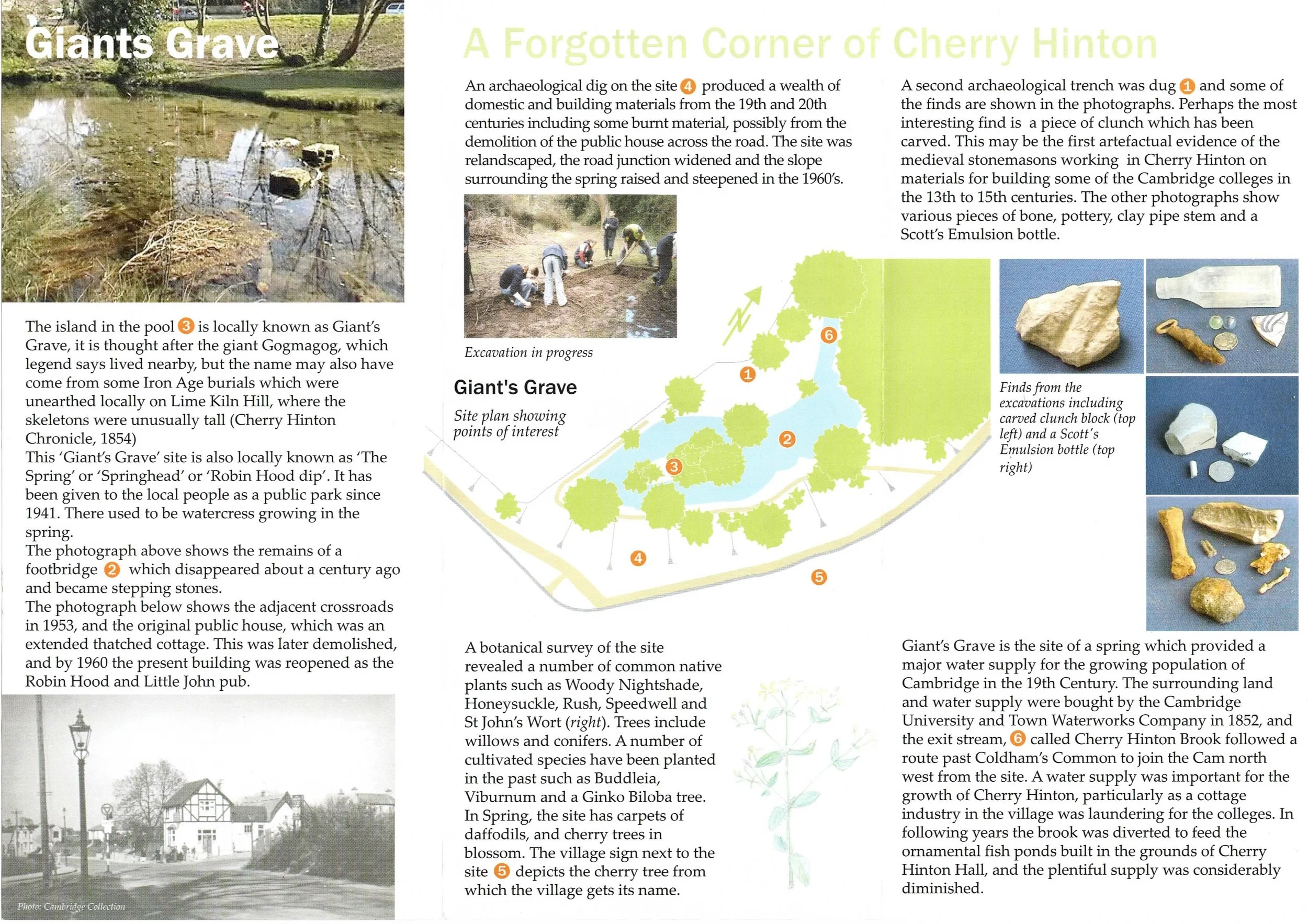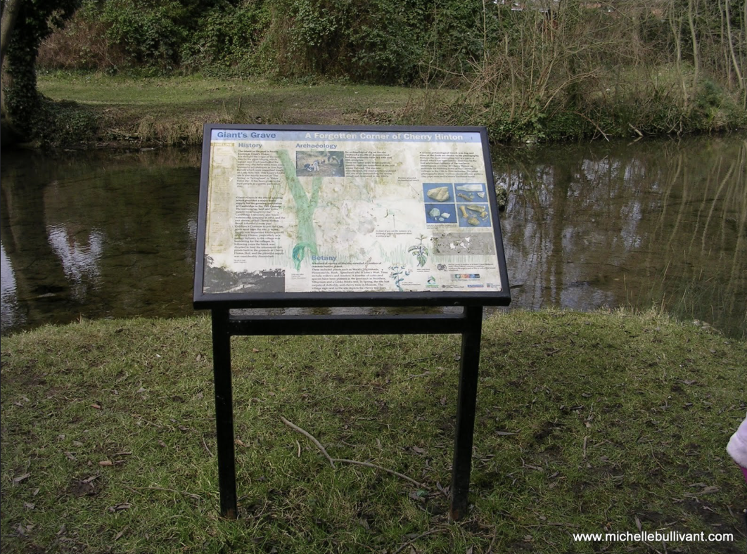 The large Spring pool opposite the Robin Hood Pub at the main crossroads into Cherry Hinton village is a very interesting place. Some villagers call it the Spring Head others call it the Giants Grave. The spring head name is easy to understand - it being a natural spring head which forms a large pool that then turns into a brook called ‘The Hinton Brook’. This in turn flows through the grounds of Cherry Hinton Hall, onwards through the Sainsbury’s car park (at the corner of Coldhams Lane and Brooks Road) and outwards across Coldhams Common to join up with the river Cam at Stourbridge Common, just off of Newmarket Road. But the strange name of Giants Grave is steeped in mystery.