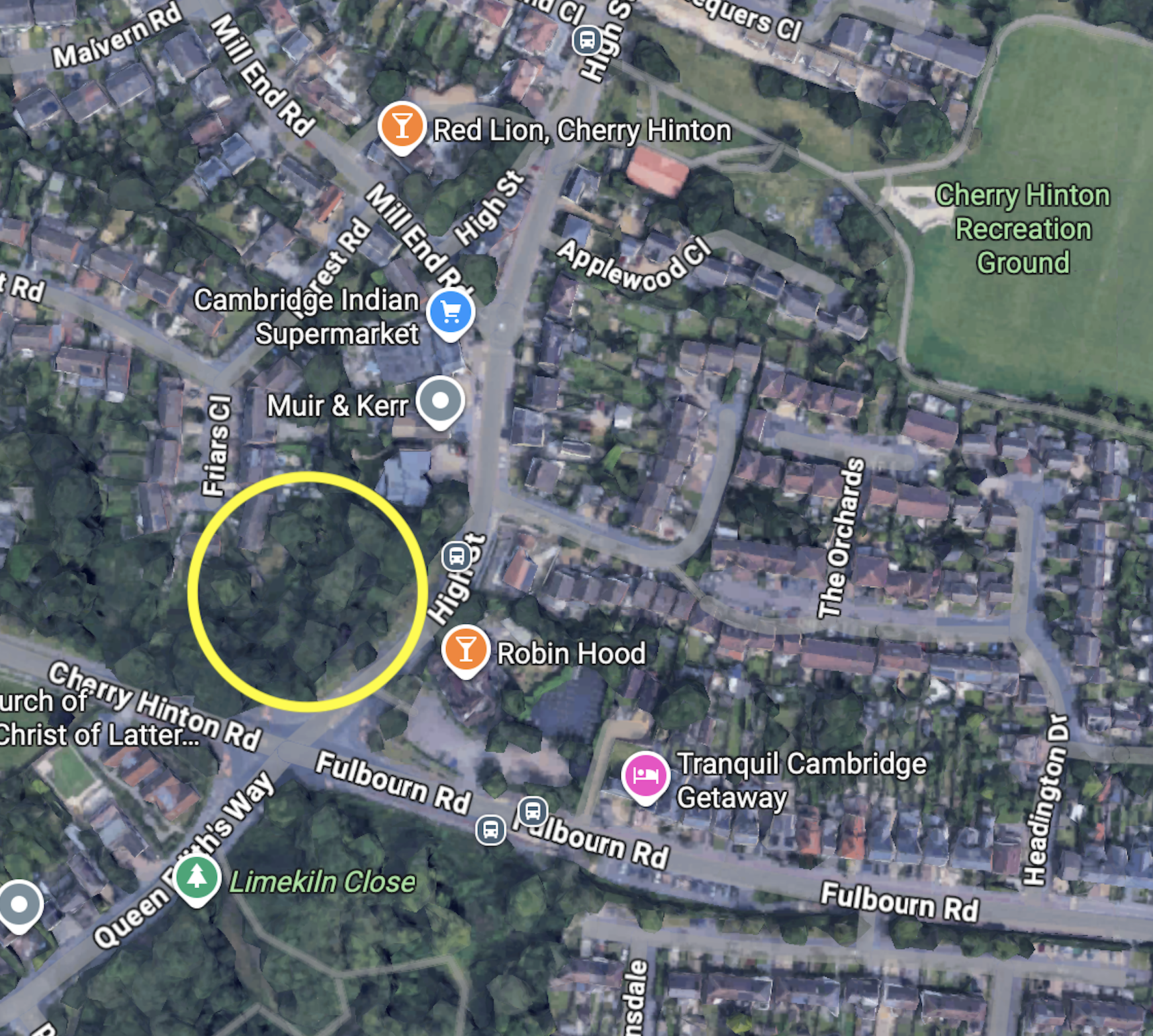 Spring Head / Giants Grave sits at the southern end of Cherry Hinton village at the crossroads of Cherry Hinton High Street, Fulbourn Road, Cherry Hinton Road and Queen Edith’s Way. It is opposite the Robin Hood Pub.