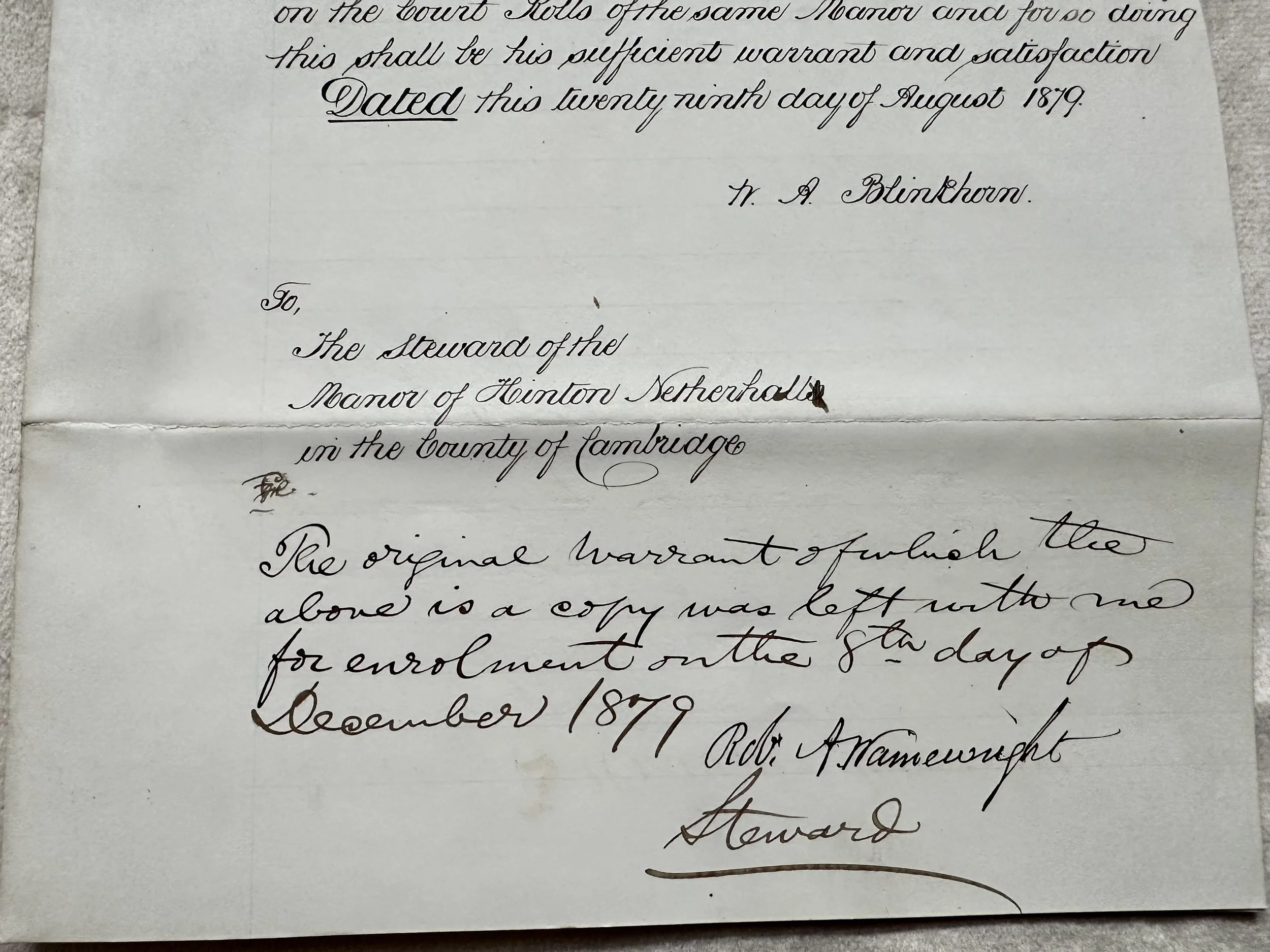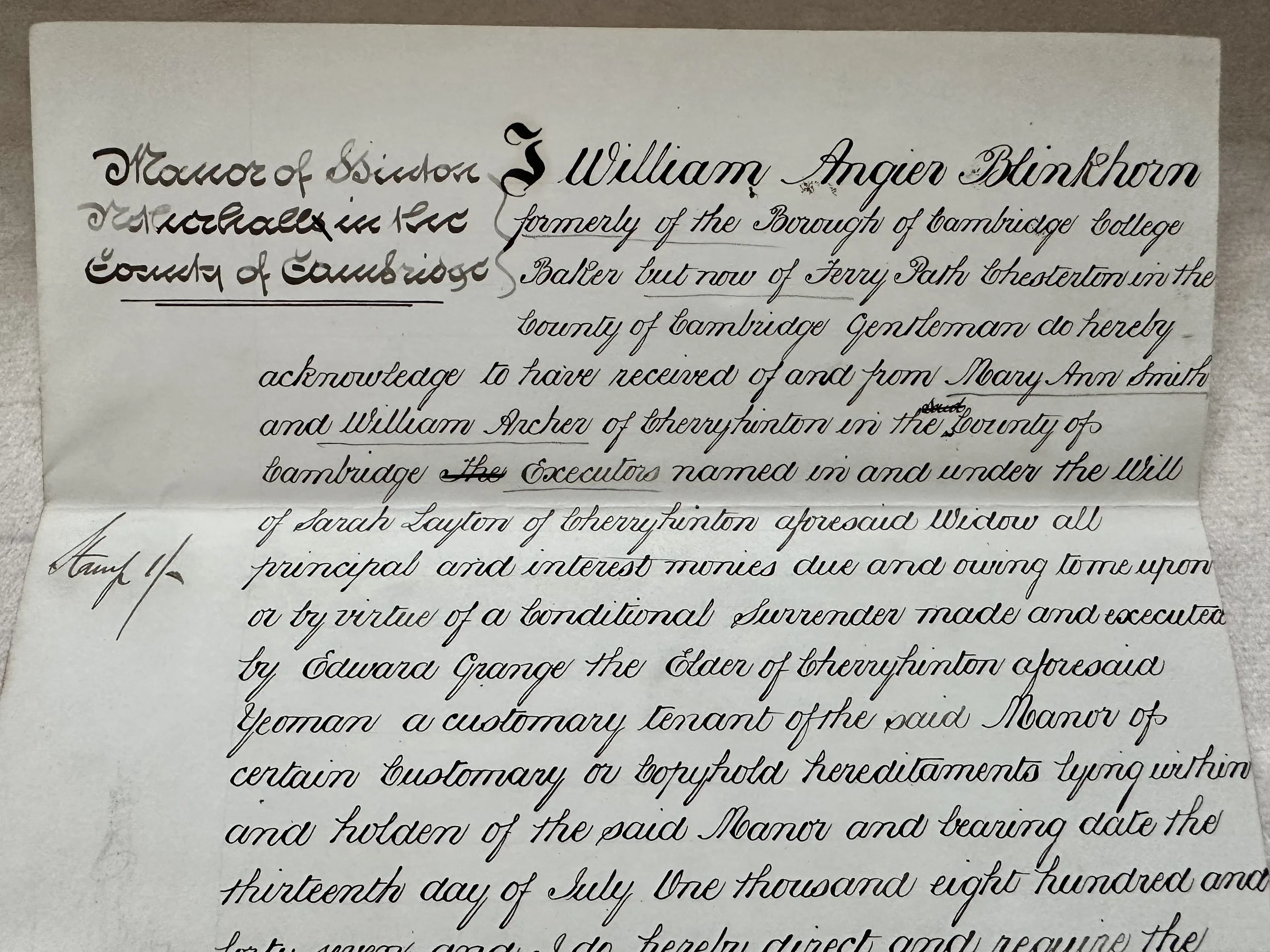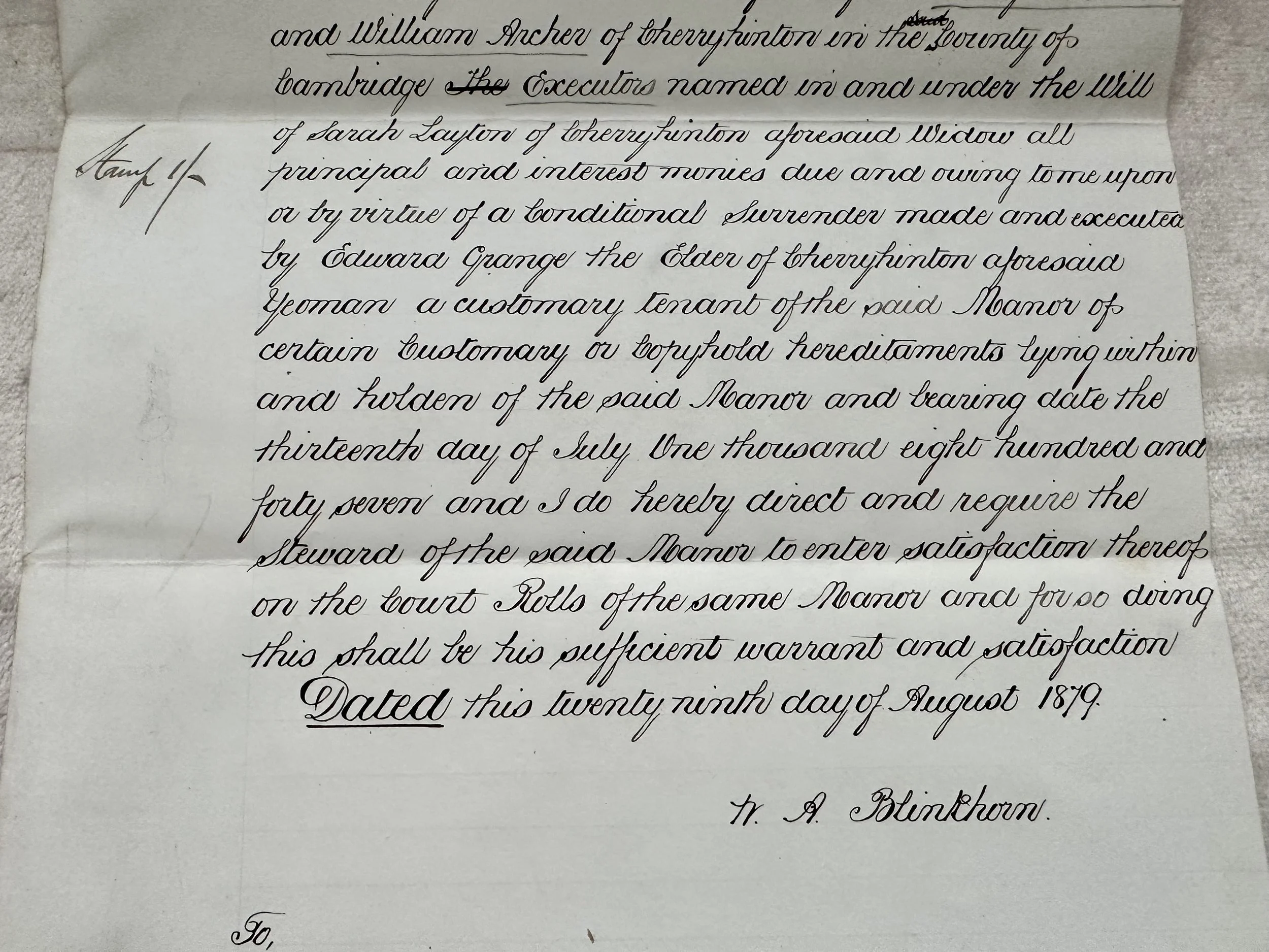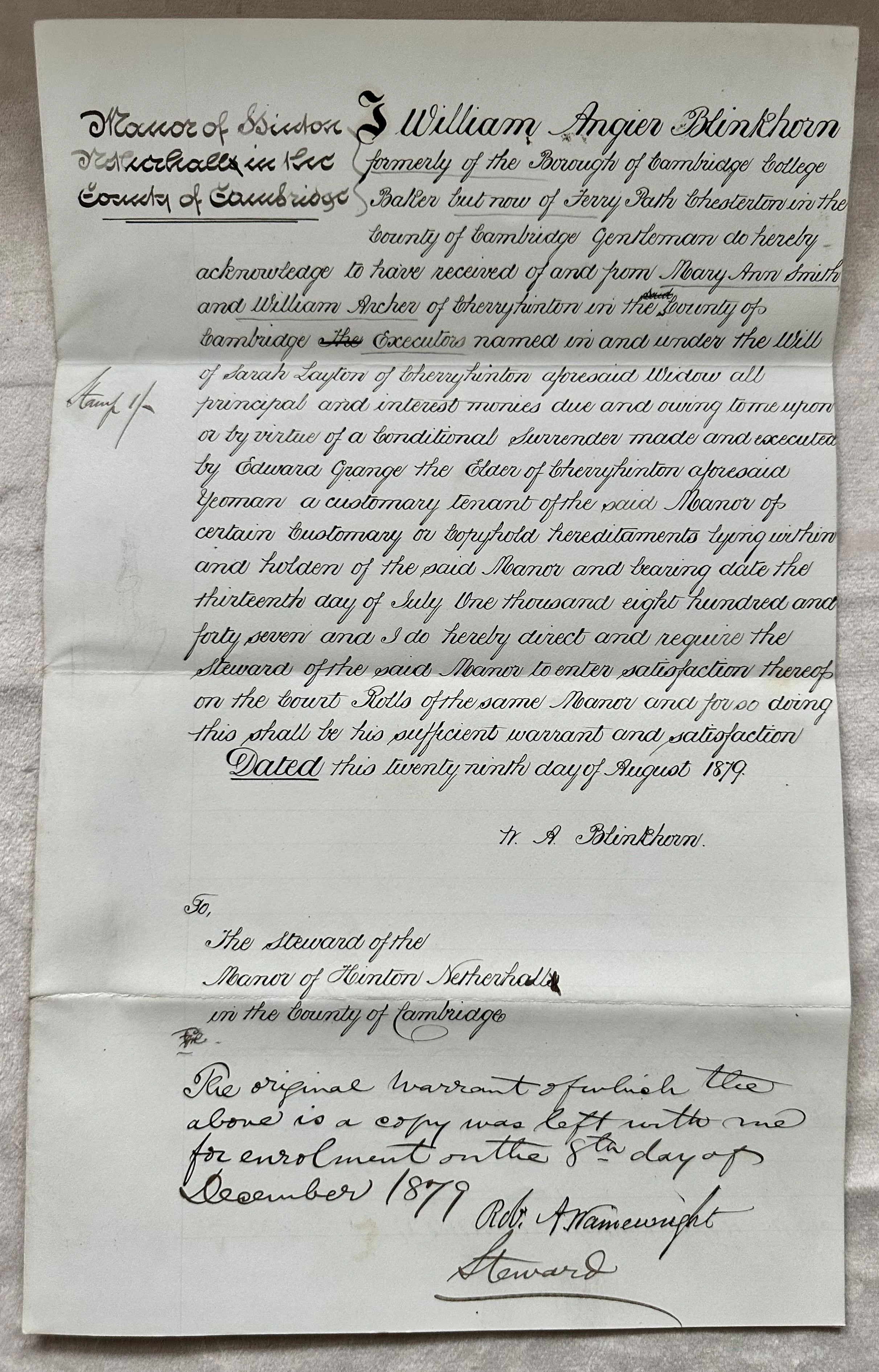 Manor of Hinton Netherhall in the County Cambridge I William Angier Blinkhorn formally of the Borough of Cambridge College Baker but now of Ferry Path in the County of Cambridge Gentleman do hereby acknowledge to have received of and from Mary Ann Smith and William Archer of Cherry Hinton in the County of Cambridge Executors named in and under the will of Sarah Layton of Cherry Hinton aforesaid widow all principle and intended monies due and owing to me upon or by virtue of a conditional surrender made and executed by Edward Grange the Elder of Cherry Hinton aforesaid yeoman a customary tenant of the said Manor of certain customary tenant of the said Manor of certain customary or copyhold hereditaments lying within and holden of the said Manor and bearing date the thirteenth day of July One thousand eight hundred and forty seven and I do hereby direct and require the steward of the said Manor to enter satisfaction thereof on the Court Rolls of the same Manor and for so doing this shall be his sufficient warrant and satisfaction Dated this tweet ninth day of August 1879