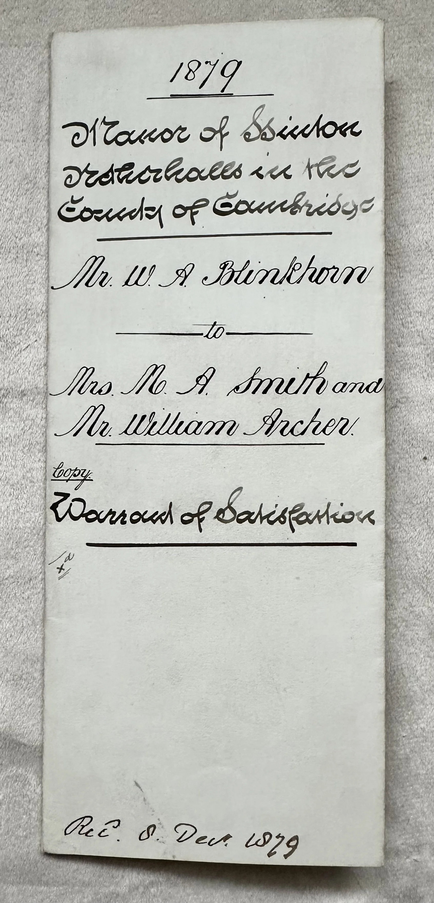 Netherhall Manor Cherry Hinton 1879 Warrant of Satisfaction from William Angier Blinkhorn, College Baker of Ferry Path Chesterton, to Mary Ann Smith and William Archer both of Cherry Hinton, from the will of Sarah Layton of Cherry Hinton.