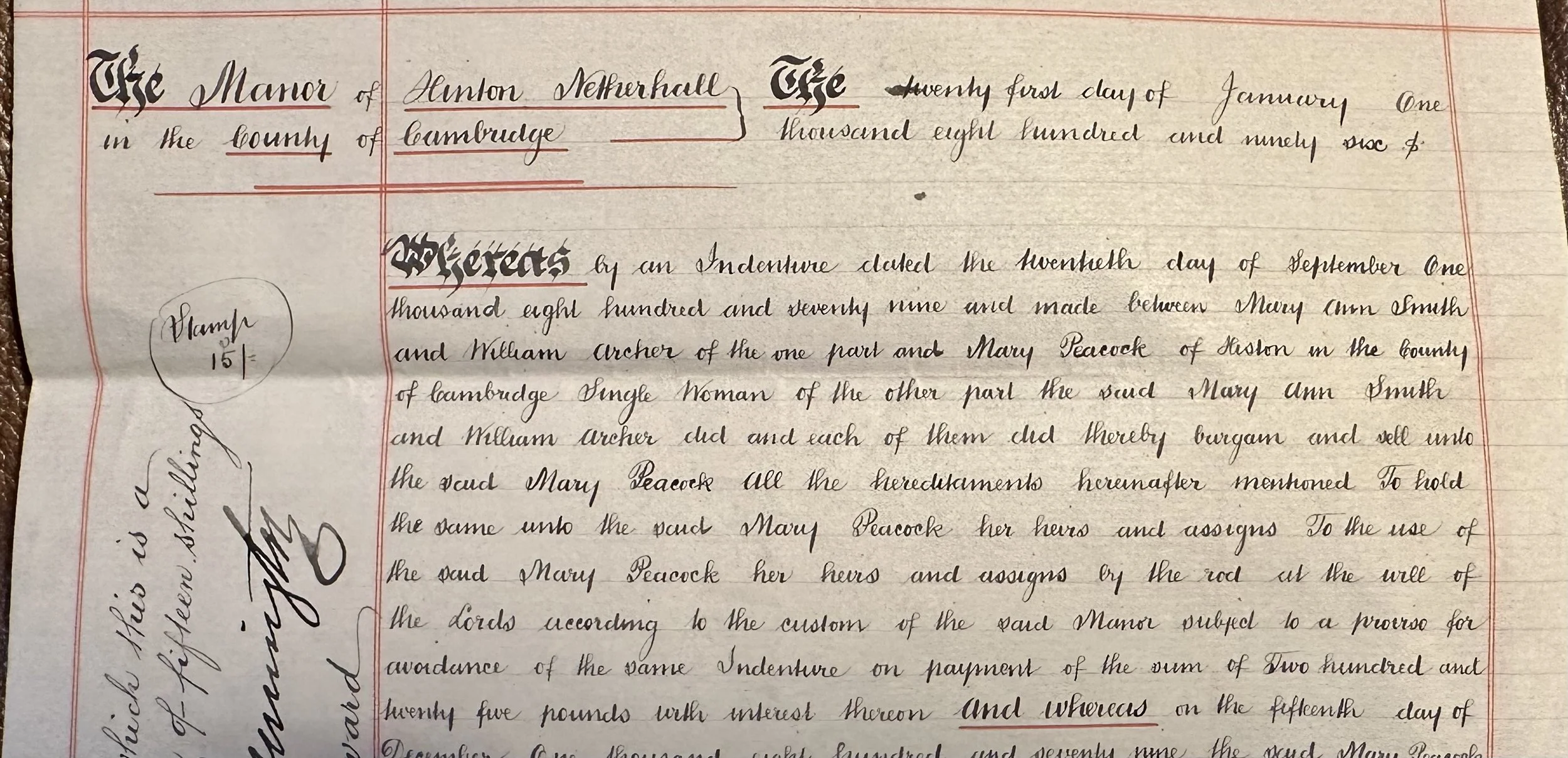 A Cherry Hinton Netherhall Manor Copyhold: Mary Peacock’s Surrender, 1896, another old document from my personal archives.