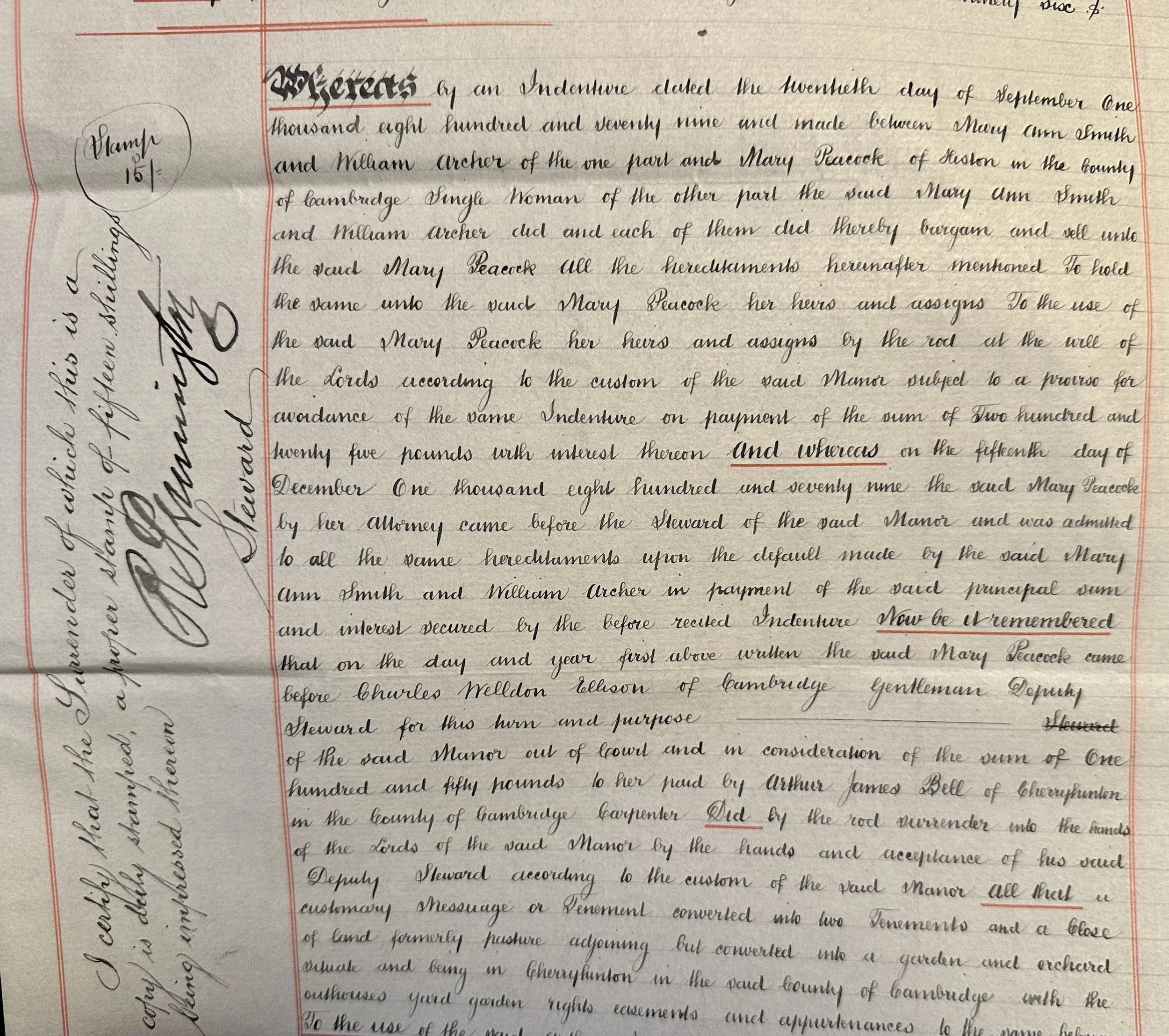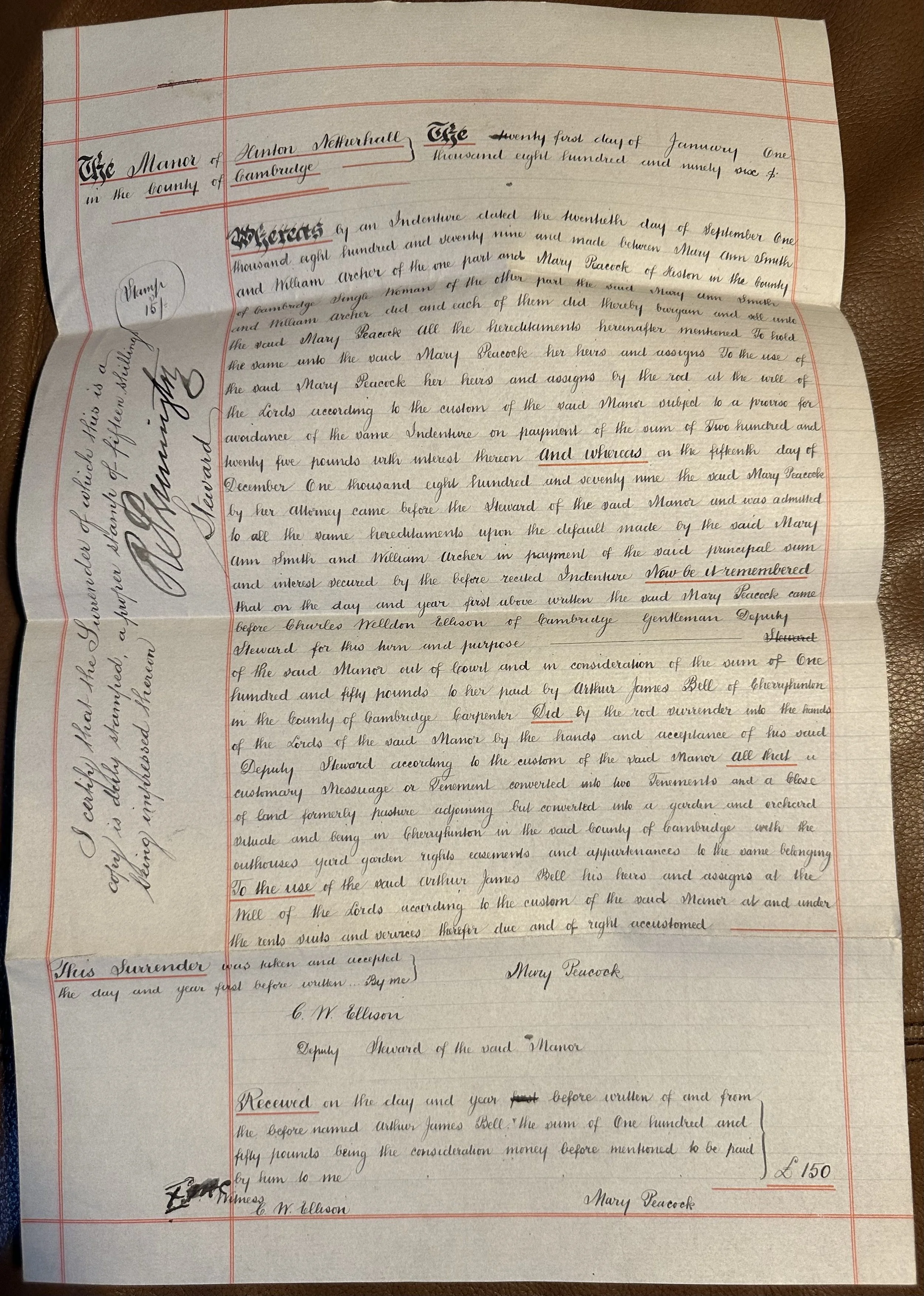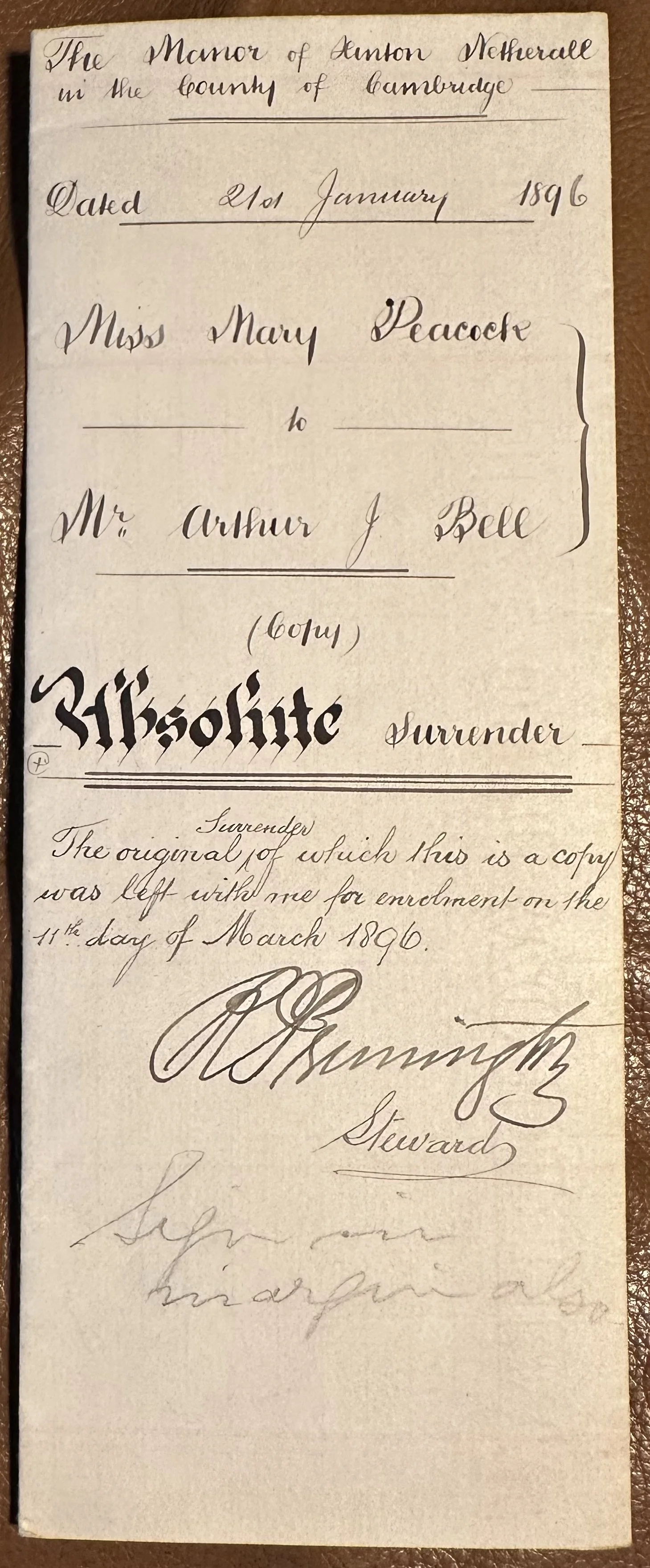 Among the surviving records of the Manor of Hinton Netherhall is this carefully written surrender dated 21 January 1896, recording the transfer of a small property in Cherry Hinton from Mary Peacock of Histon to Arthur James Bell, carpenter.