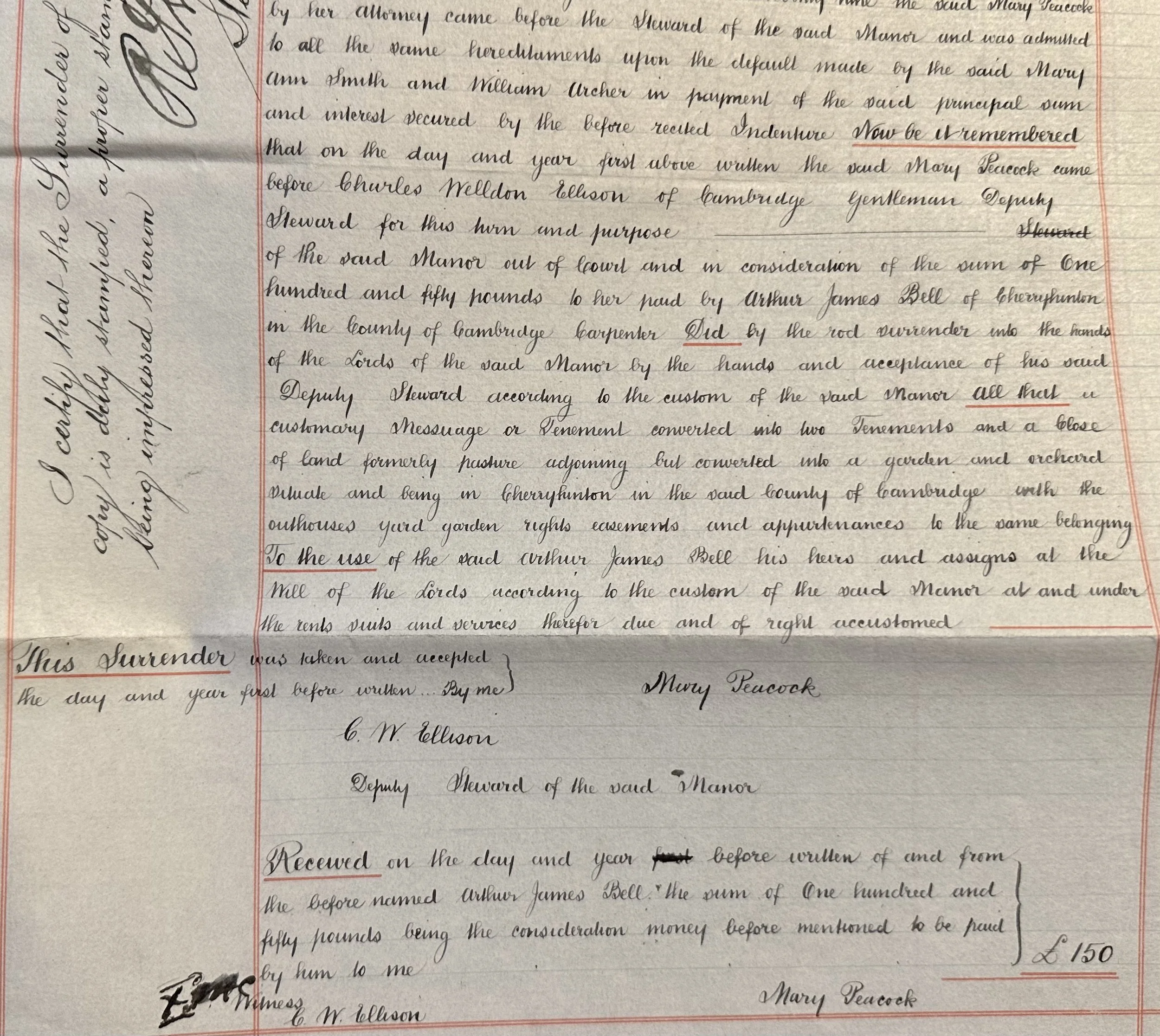 Now, in 1896, Mary Peacock surrendered the property to the Lords of the Manor for the use of Arthur James Bell of Cherry Hinton, carpenter, in exchange for a payment of £150.