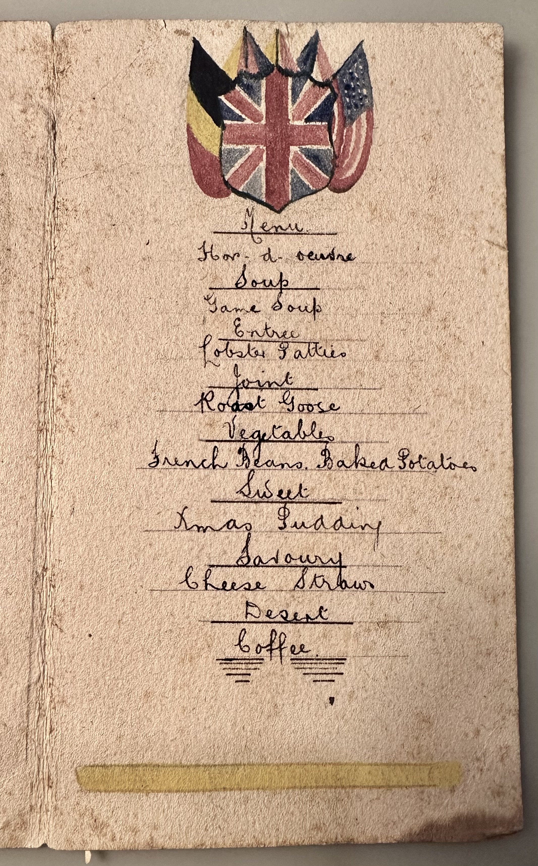This is a hand drawn and painted Christmas Menu from the First World War. It belonged to Cambridge born Harry Edward Hogg (1879-1943) who lived at 50 Brookfields Cambridge with his family. Before the war he was working as a pastry cook at Pembroke College Cambridge and when he had came home from the war he went back to work as a chef at the college.