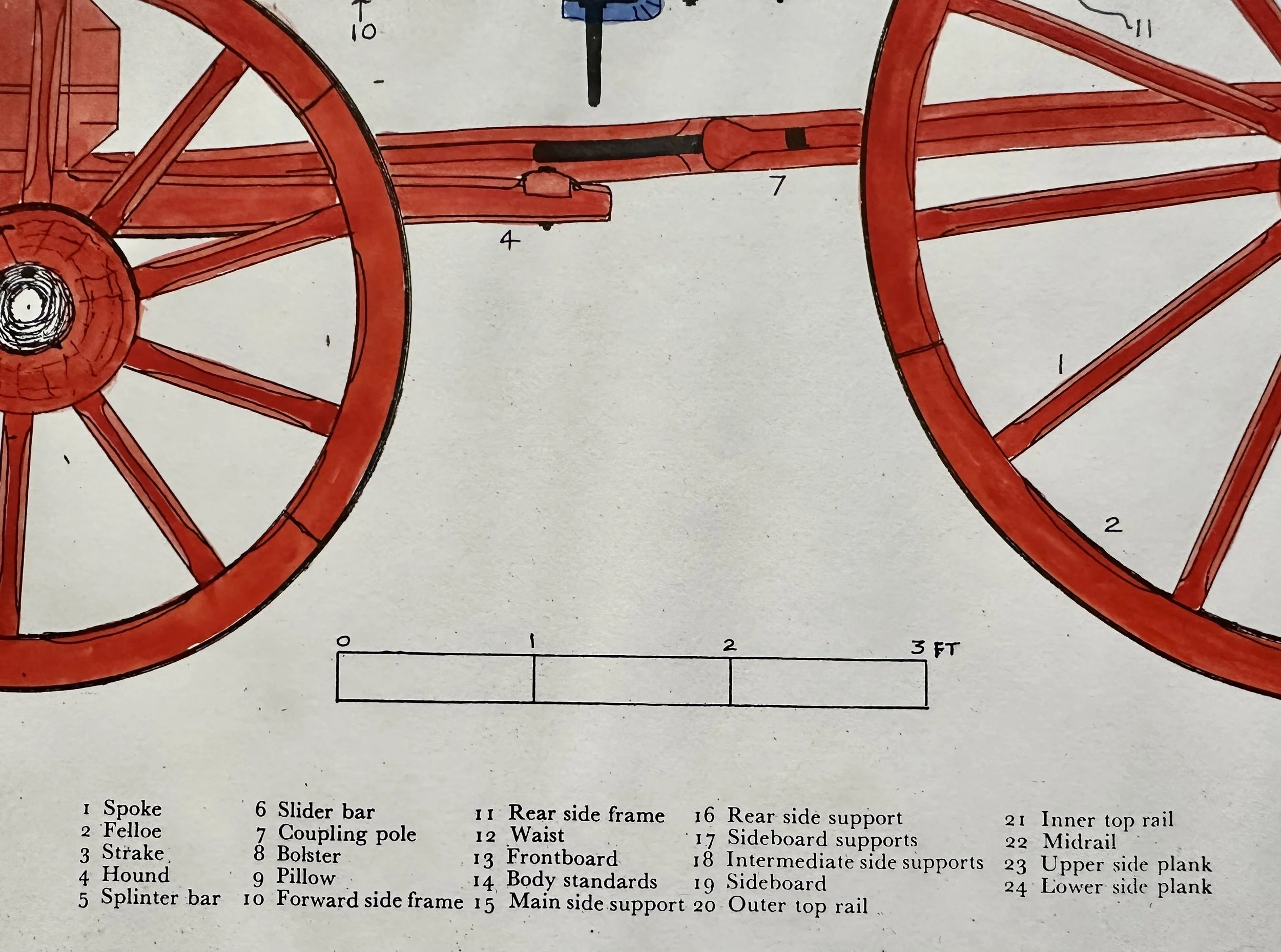 East Anglian Box Wagon plan - hand drawn and coloured picture of a traditional East Anglian Box Wagon drawn by Don Beards 1979. This picture was exhibited by Wagon Enterprises at the Castle Hill Gallery, 12 Castle Street Cambridge. This picture was donated by Sandra and Keith Day.