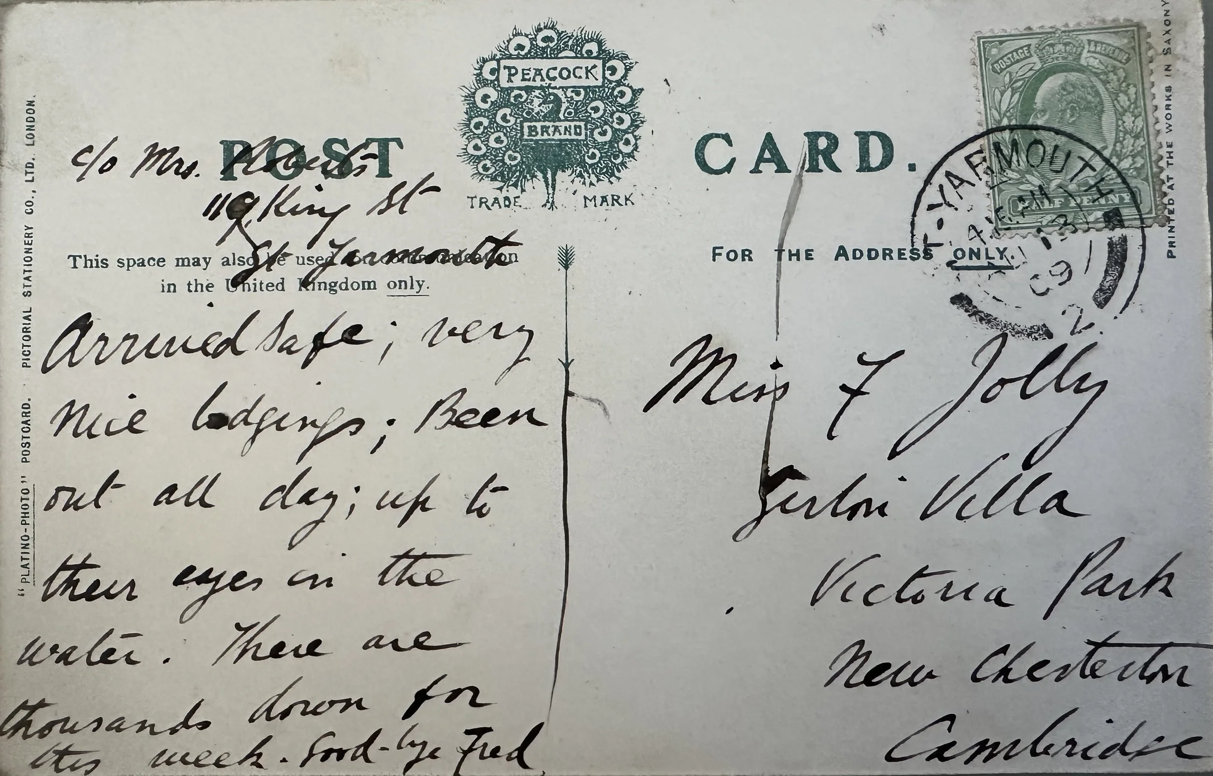 An old postcard of The Britannia Pier in Great Yarmouth sent to Cambridge. The postcard reads:
